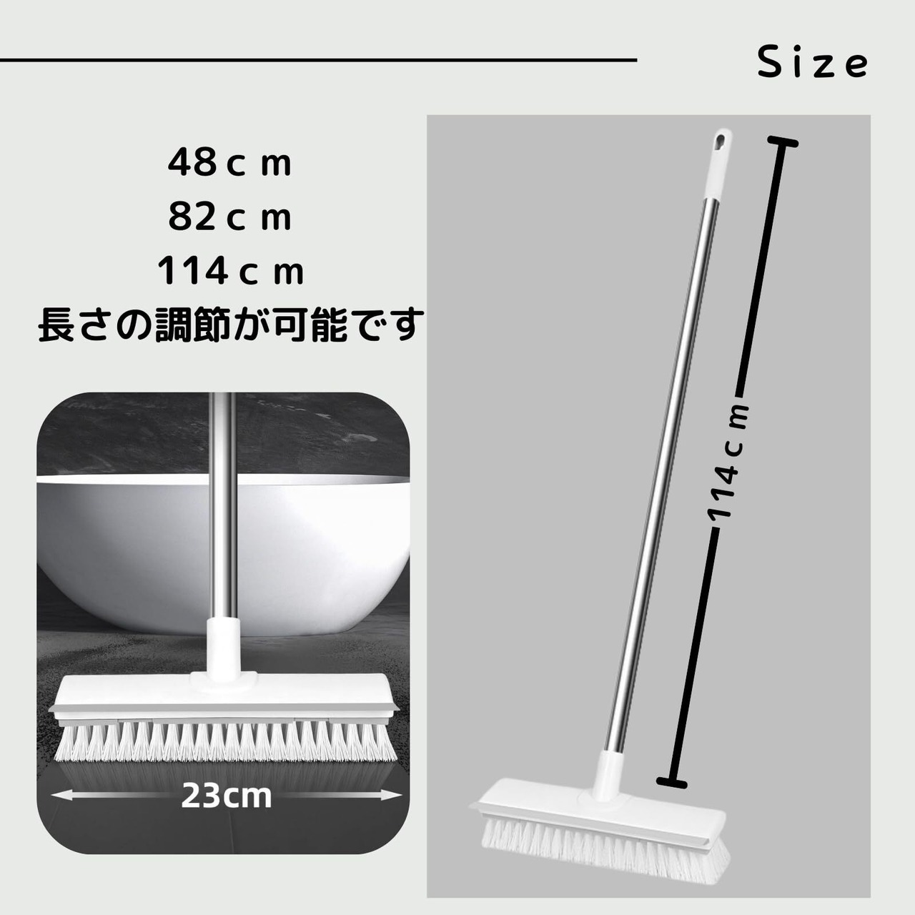 【用途によって長さの調節が可能】用途や使う人に合わせて長さを3段階に調節可能です。35cm、75cm、113cmの三段設計。ベランダ、玄関、お風呂場など、様々な場所の清掃に対応できます。軽量設計なので、長時間の清掃作業でも疲れにくいです。女性や高齢の方でも扱いやすく、負担を軽減します。