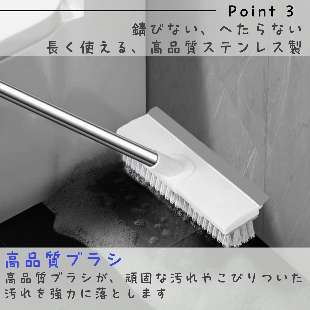【ブラシ&水切りの2way仕様】デッキブラシと水切りが一体化した掃除用品です。ブラシで汚れを落とした後、すぐにワイパーで水切りができるので、作業効率が大幅に向上します。二つの道具を持ち替える手間が省けます。1本で様々な箇所の掃除や仕上げができます。ワイパーは水切れが良く、床面を素早く乾燥させます。カビや水垢の発生を抑制します。