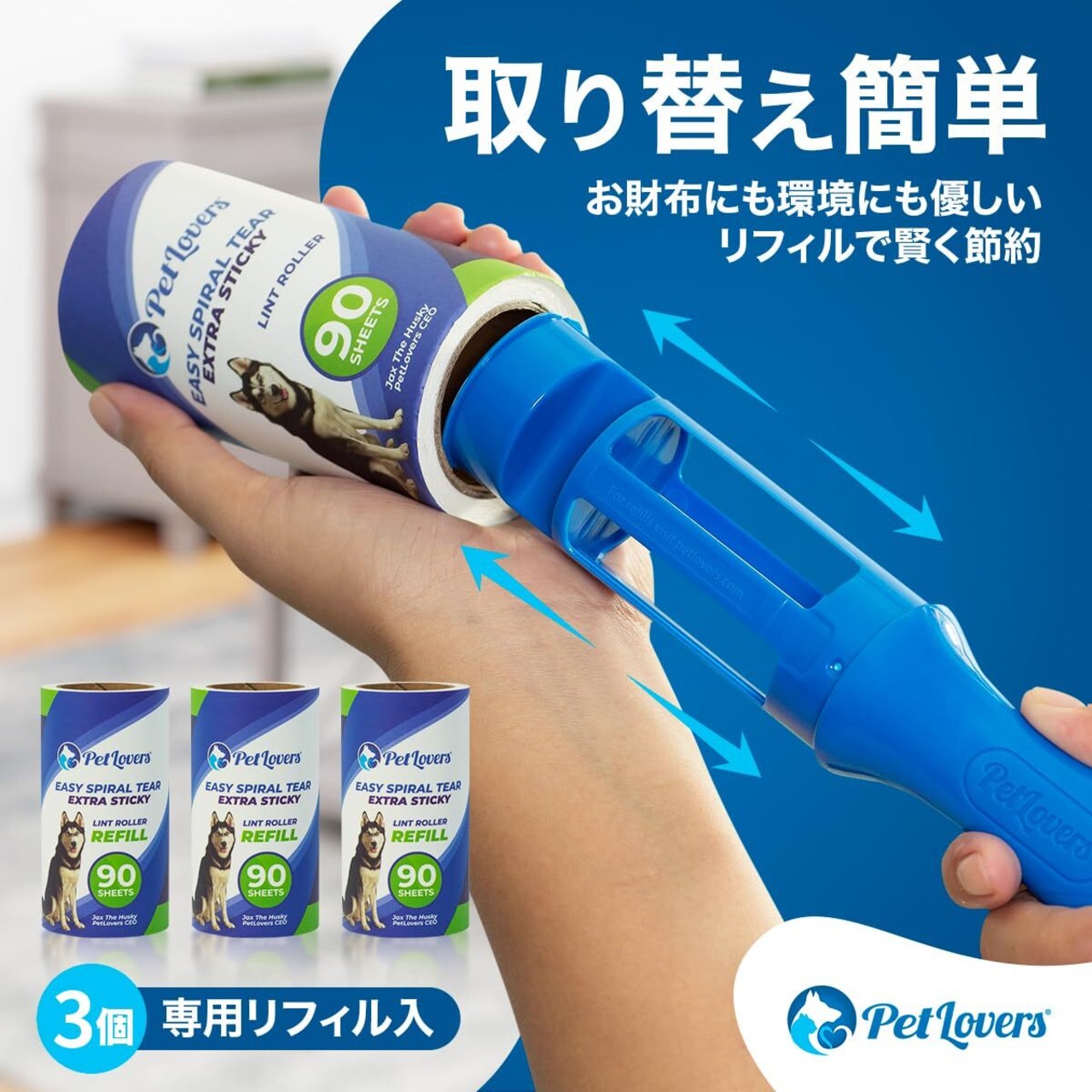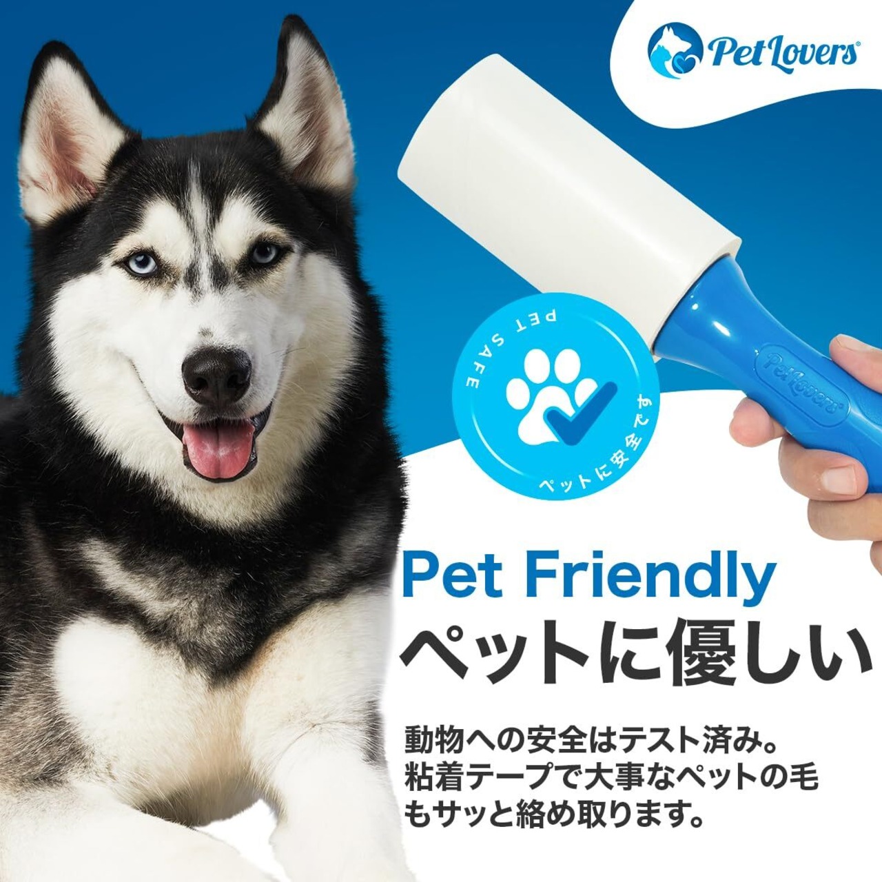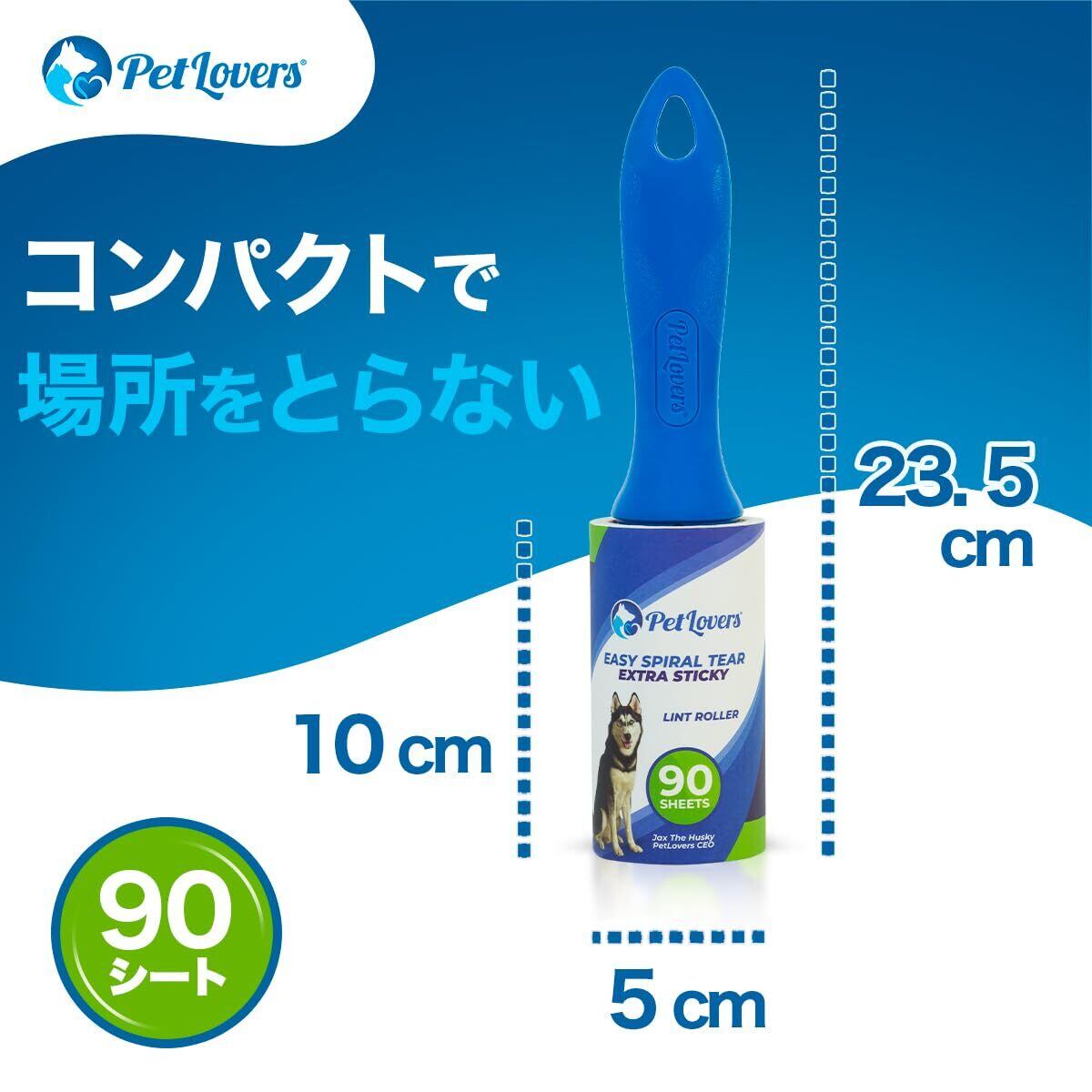 "PetLovers(ペットラバーズ)超強力 粘着ローラークリーナー5本セット。ななめカットでめくりやすい、ペットの毛のお掃除にピッタリのリントローラー本体1本+替え3本 (計4本セット - 360シート)です。 コロコロと滑らかな回転で使いやすさ抜群のローラークリーナー本体1本を、ななめカットではがしやすい強力粘着シートのスペア3本とセットにしてお届けします。 収納もカンタンな小型サイズ。衣服やカーペットに付着した、ペットの抜け毛や小さなホコリまで、お掃除の様々な場面にお使いいただけます。特に家中のあらゆる場所に付着しがちなペットの毛にも、ペットラバーズのローラークリーナーならサッとすばやくお掃除できます。特に普段ペットの抜け毛取りで猫ブラシなどをご使用されている場合には、細い毛があらゆる場所に付着しがちなため、すばやくカンタンにお掃除できる当商品はおススメです。 粘着式のローラークリーナー1本とスペアの替えが3本(計4本・全360シート)がセットになっています。ななめにカットされたスパイラルな形状で剥がしやすい粘着シートが特徴です。改善に改善を重ね、今までで一番使いやすいローラークリーナーとなりました。 また、当社では、トレードマークになっている犬の執行役員ハスキー犬のジャックスがたくさん落としていく抜け毛を利用して商品の性能を検証、強力な粘着力で綺麗に拾いあげることが確認できました。もちろんペットの抜け毛だけでなく、ホコリや小さなゴミにもお使いいただけるため、ちょっとしたお掃除にも便利です。 スムーズにコロコロ回転するようにデザインされたローラーでストレスフリーなお掃除を実現、他の類似製品で使いにくさが気になったことのある方にもオススメできる仕様になっています。 PetLovers(ペットラバーズ)の超強力な粘着クリーナーは、身だしなみツールとしても強い味方で、衣類やカーペットなどの家具についたペットの抜け毛やホコリをすっきりと取ることができます。"