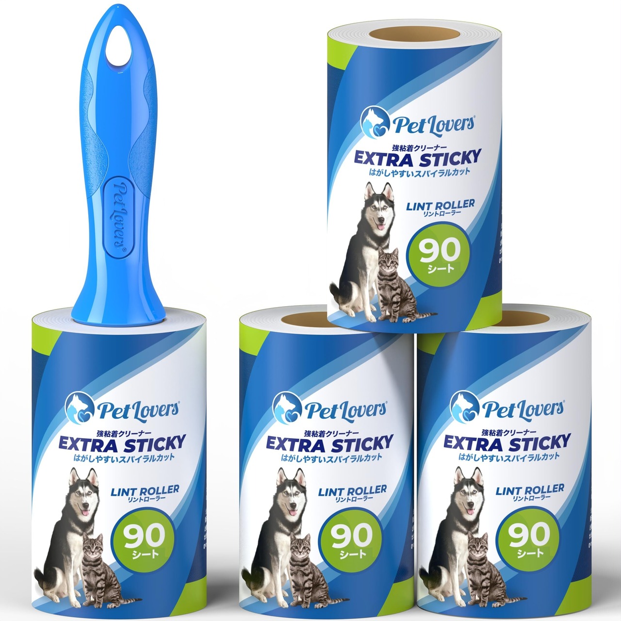 【数量限定】PetLovers(ペットラバーズ)強力 粘着 ローラークリーナー 4本セット (本体1本+替え3本 - 計360シート) ななめカット めくりやすい ペットの毛取り 犬の毛 猫の毛 掃除 リントローラー
