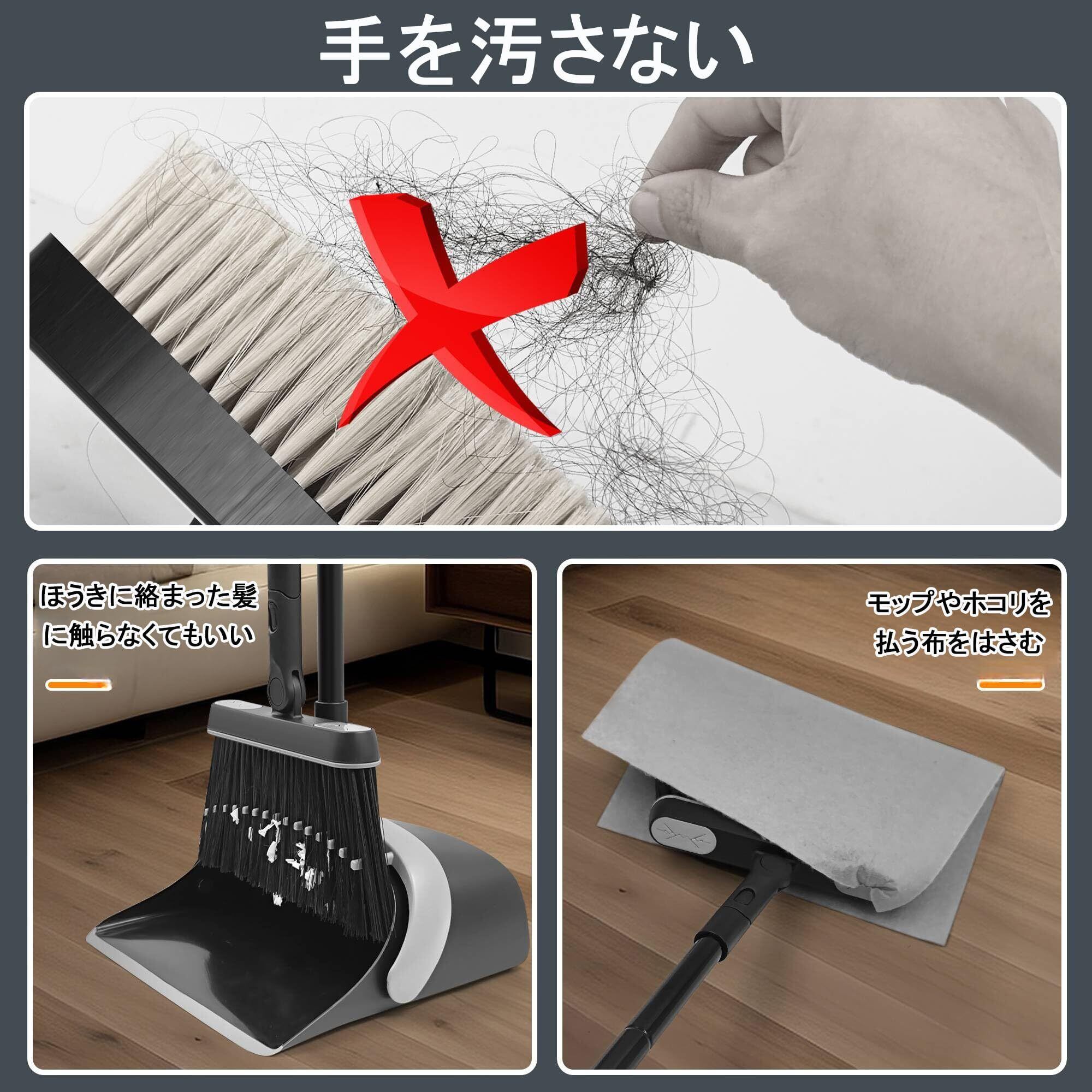 ほうき ちりとり:ほうきヘッドの2つのスナップは、窓拭き、モップ掛け、掃き掃除などの不織布と連動します。また、180度回転するヘッドで、ベッドやテーブルの下など、目隠しになる場所の掃除も簡単です。