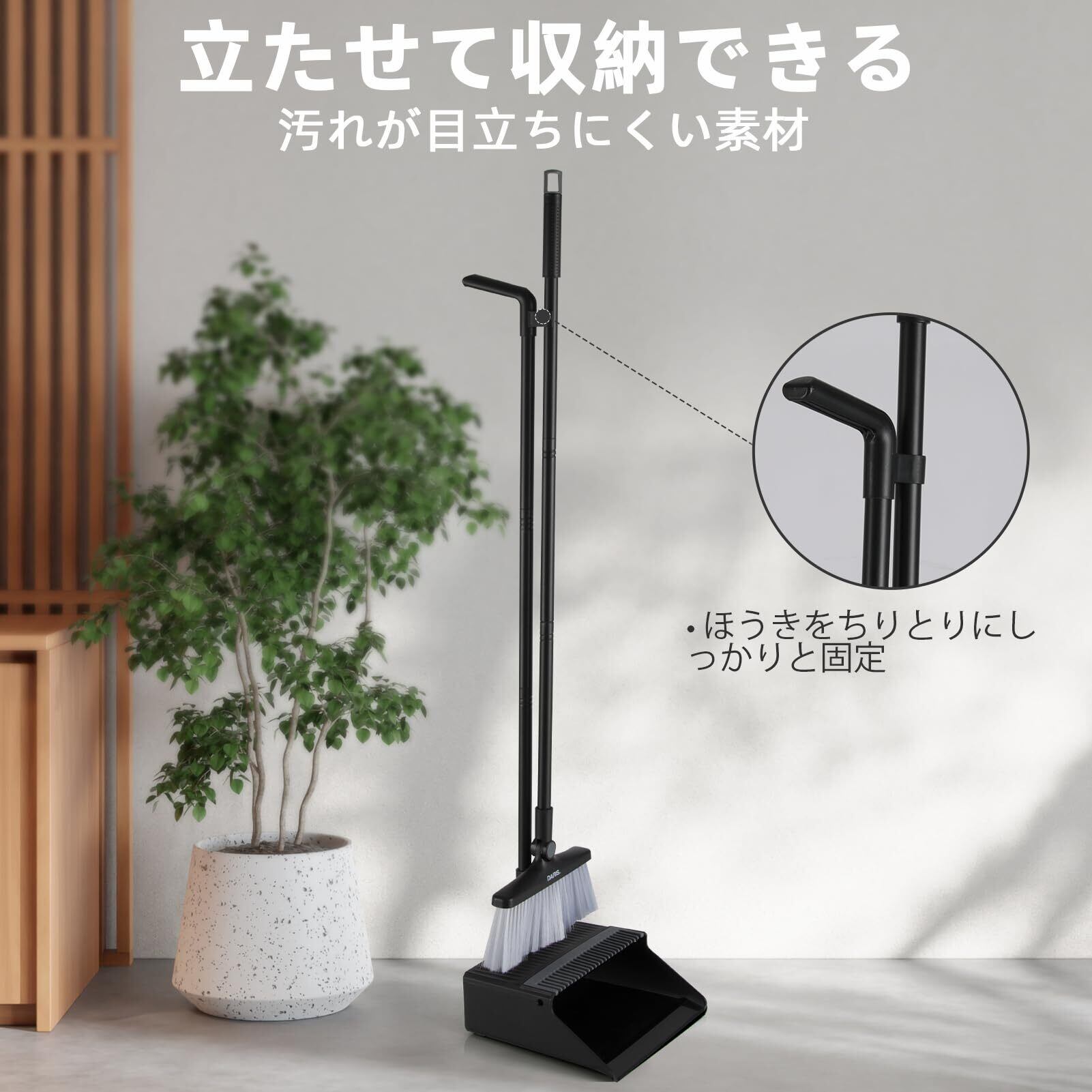 【掃きやすく、立たせてすっきり収納】掃きやすいほうきと、ゴミがこぼれにくいちりとりのセットです。立たせてすっきり収納できます。