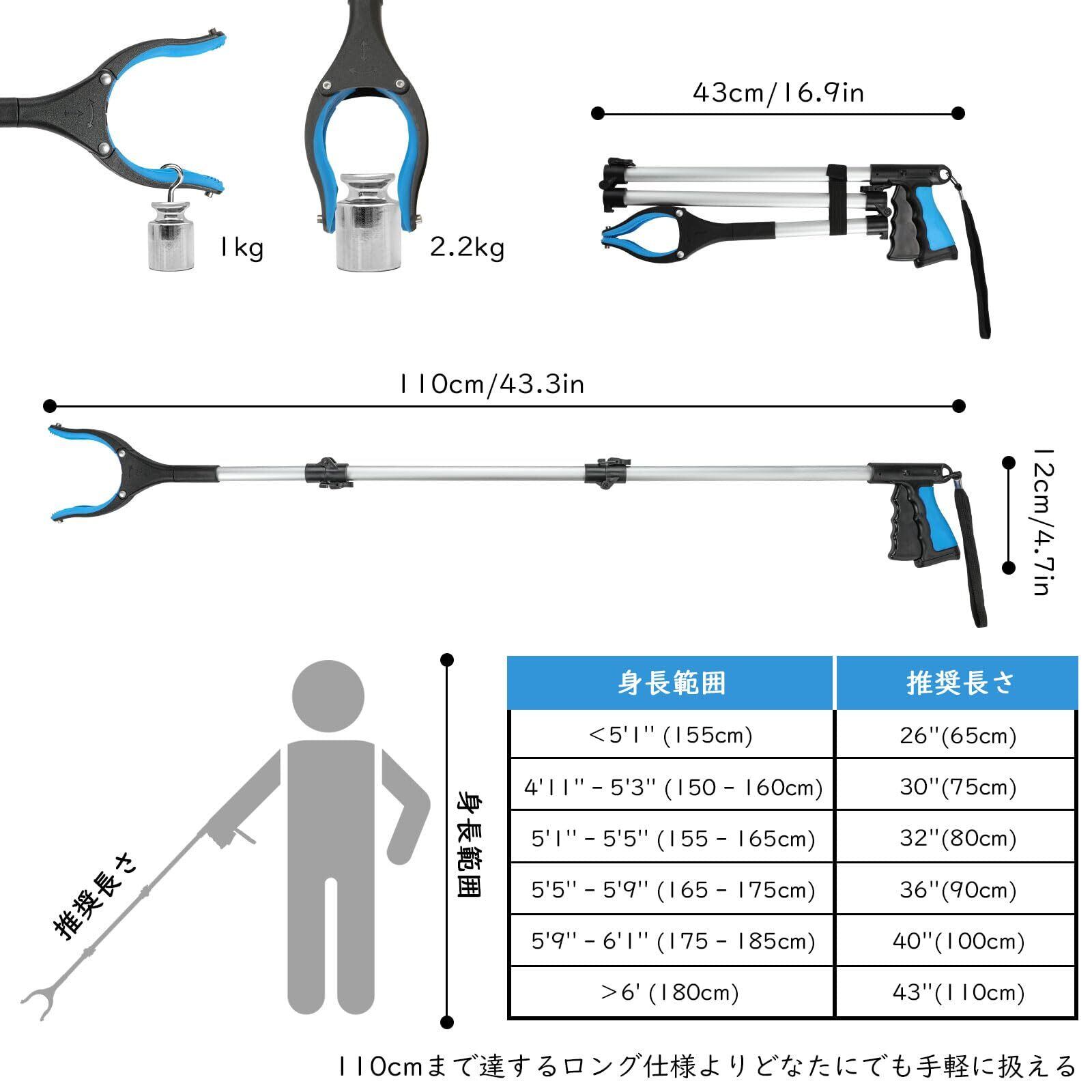 「耐久性にすぐれた上質な素材」グリップ部分にも人間工学に基づいた握りやすい一体型で、肌に優しいほどよい厚みのゴムを搭載した設計しております。つまみ先端部にも滑り止めのゴム張りの仕上がりで、薄いティッシュやフィルム・丸いボトルなど表面がつるつるしたものでも掴みやすくしっかりキャッチできます。アーム本体にはサビに強く、軽量性と耐久性を兼ね備えたアルミ合金を採用しており、長続きにご利用いただけます。