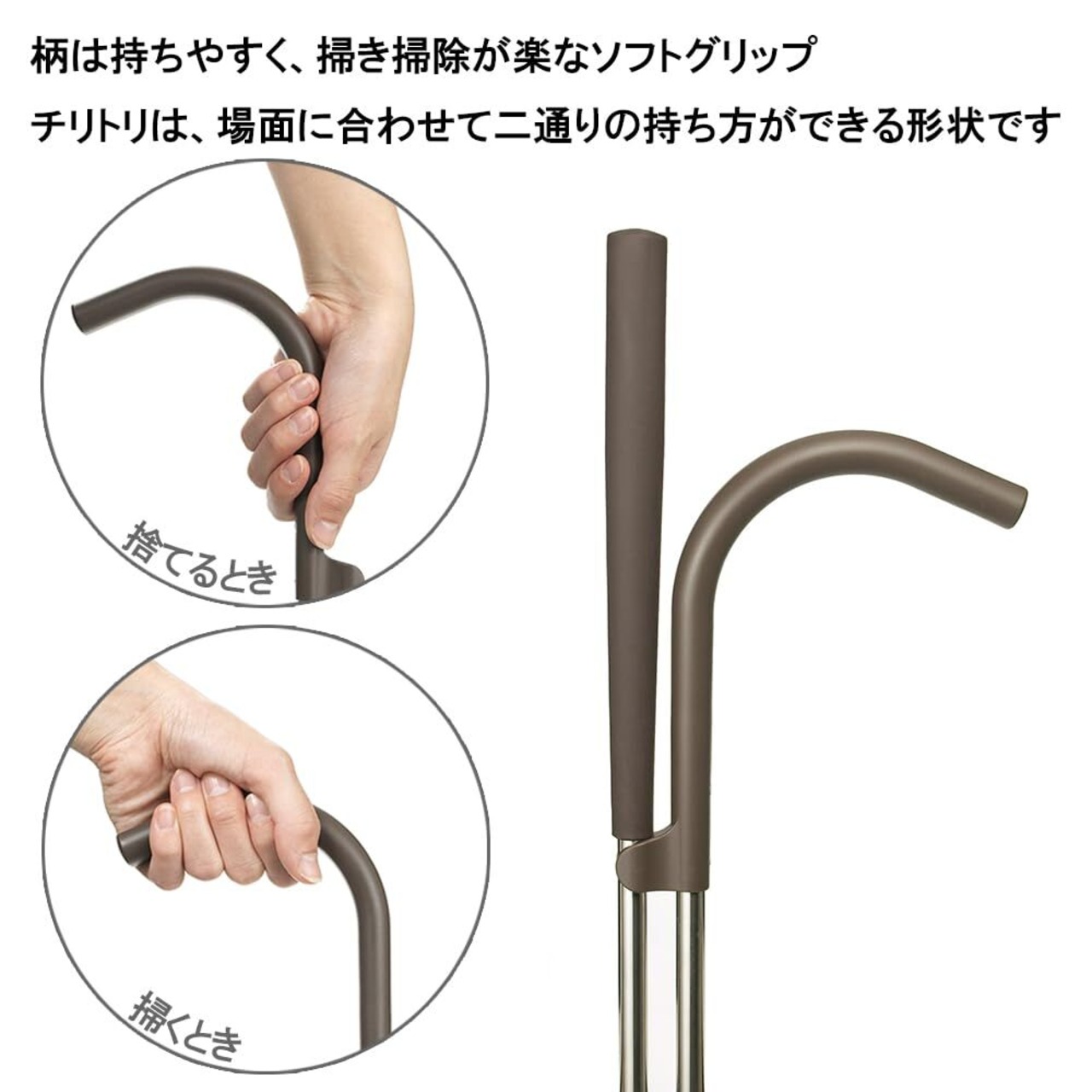 チリトリの持ち手は、傘の柄のような設計。持ちやすく、ゴミを集める時と捨てる時で握る位置を変えるとスムーズに作業ができる