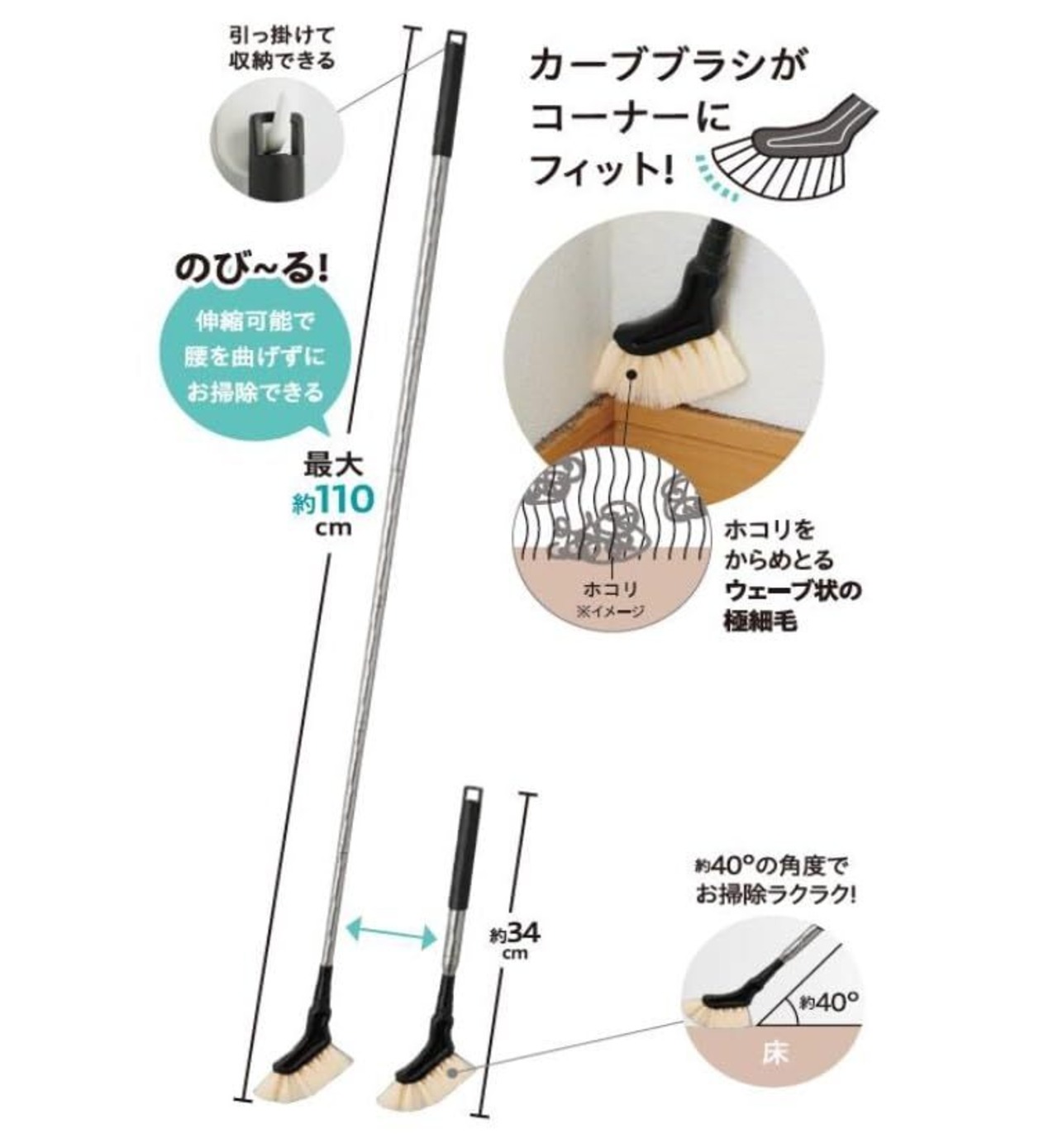 手が届きにくいすき間の汚れやホコリをラクラクお掃除! カーブブラシがコーナーにフィット! ホコリをからめとるウェーブ状の極細毛 引っ掛けて収納できる のび~る!伸縮可能で腰を曲げずにお掃除できる 最大約110cm 約40°の角度でお掃除ラクラク! 用途に合わせて、伸ばして!縮めて! 巾木に、洗濯機のすき間に、TV裏に、階段に