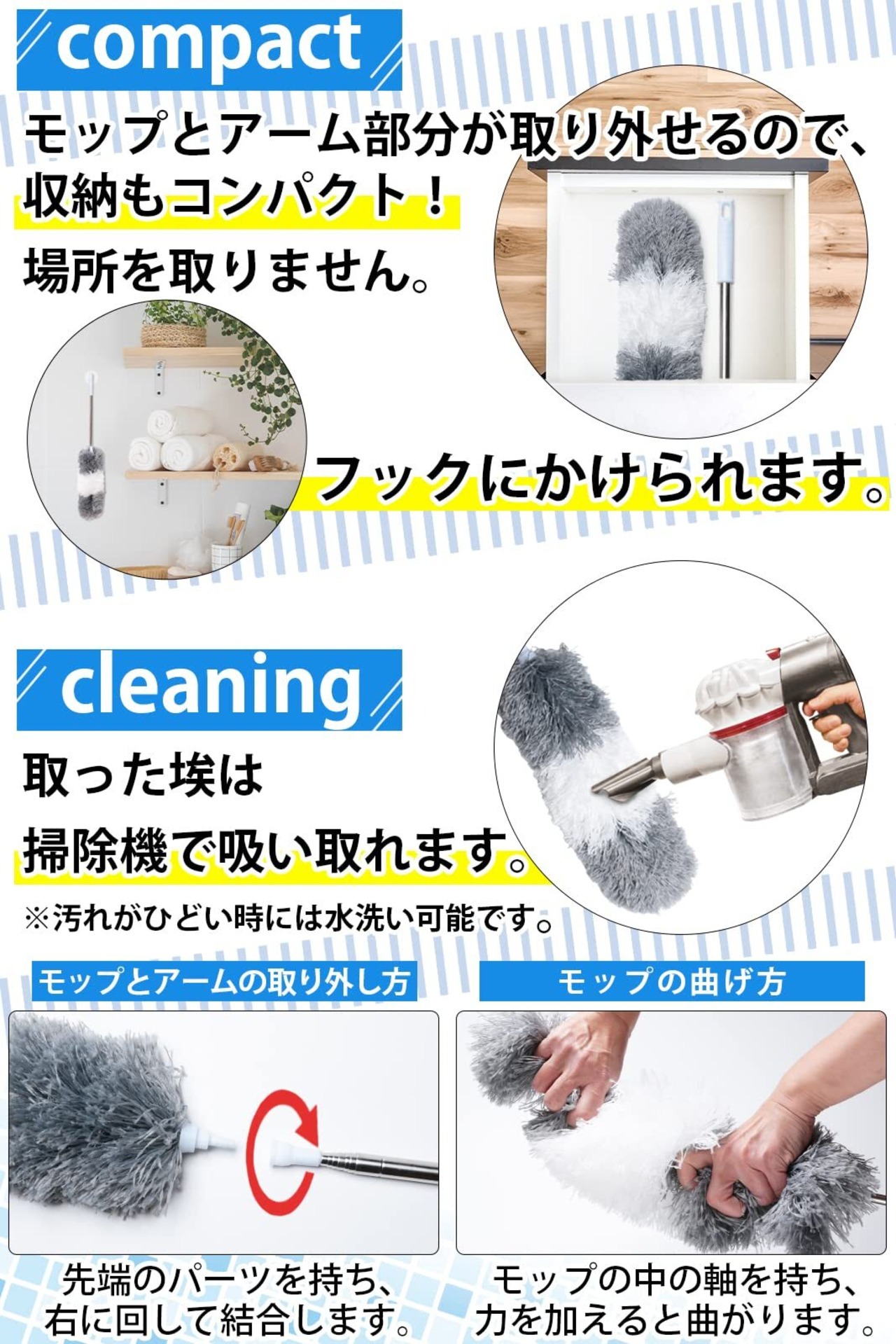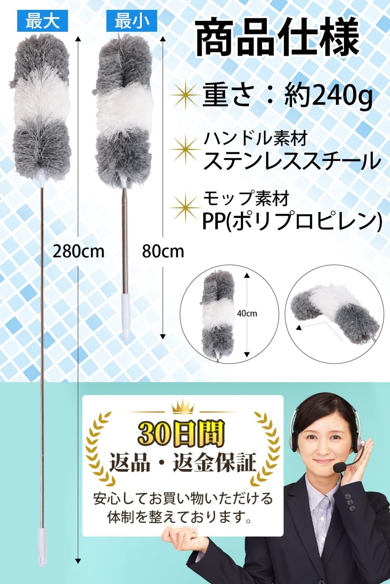 ■コンパクト収納・安心サポート付き モップとアームは取り外し可能でコンパクトに収納。30日間のアフターフォロー体制でご購入後も安心。●伸縮の長さ約80-280cm●重さ約240g●ステンレスポール本体:プラスチック●ホコリ取りのヘッドとグリップ:超極細繊維ポリプロピレン(マイクロファイバー)●モップ:PP(ポリプロピレン)
