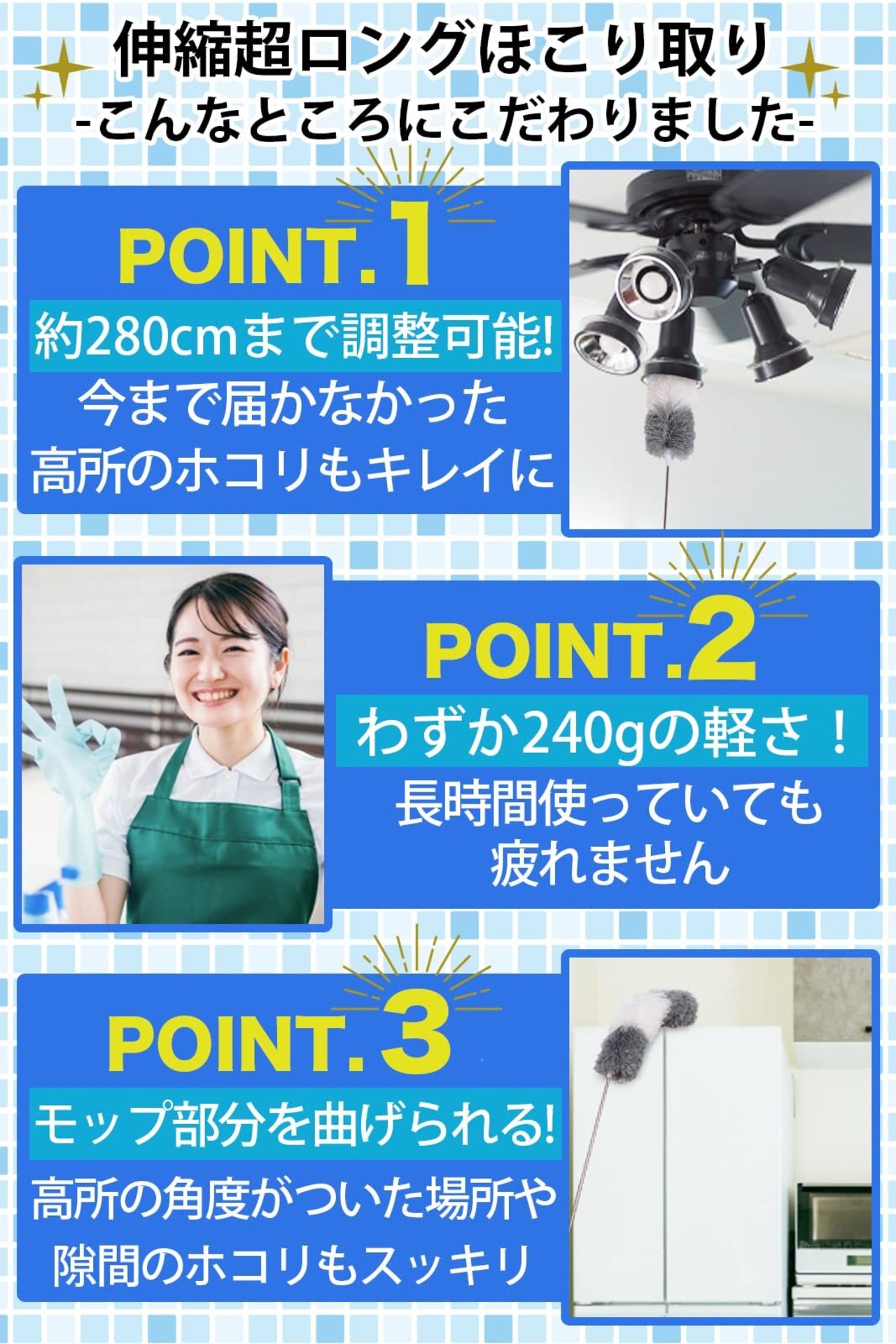■最長280cmで高所に届く うれしい超ロングサイズ。カーテンレール、ベッドの下、家具の裏、棚の上、吹き抜け、屋外照明、駐車場の屋根など、簡単に届きます。