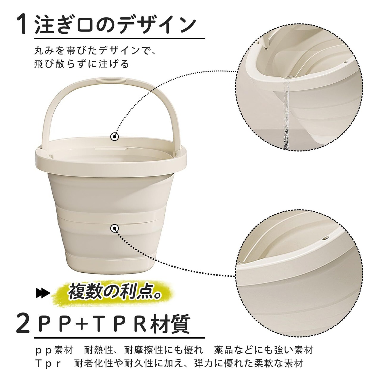 【幅広いシーンで活躍】折りたためるバケツは掃除、洗濯、ガーデニング、洗車など幅広いシーンで活躍します。また荷物を最小限にしたいキャンプやツーリング、釣りなどのアウトドアにも最適です。