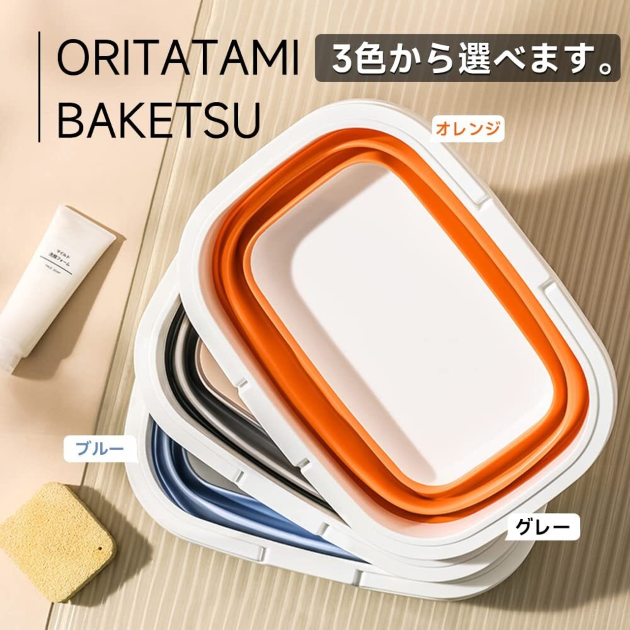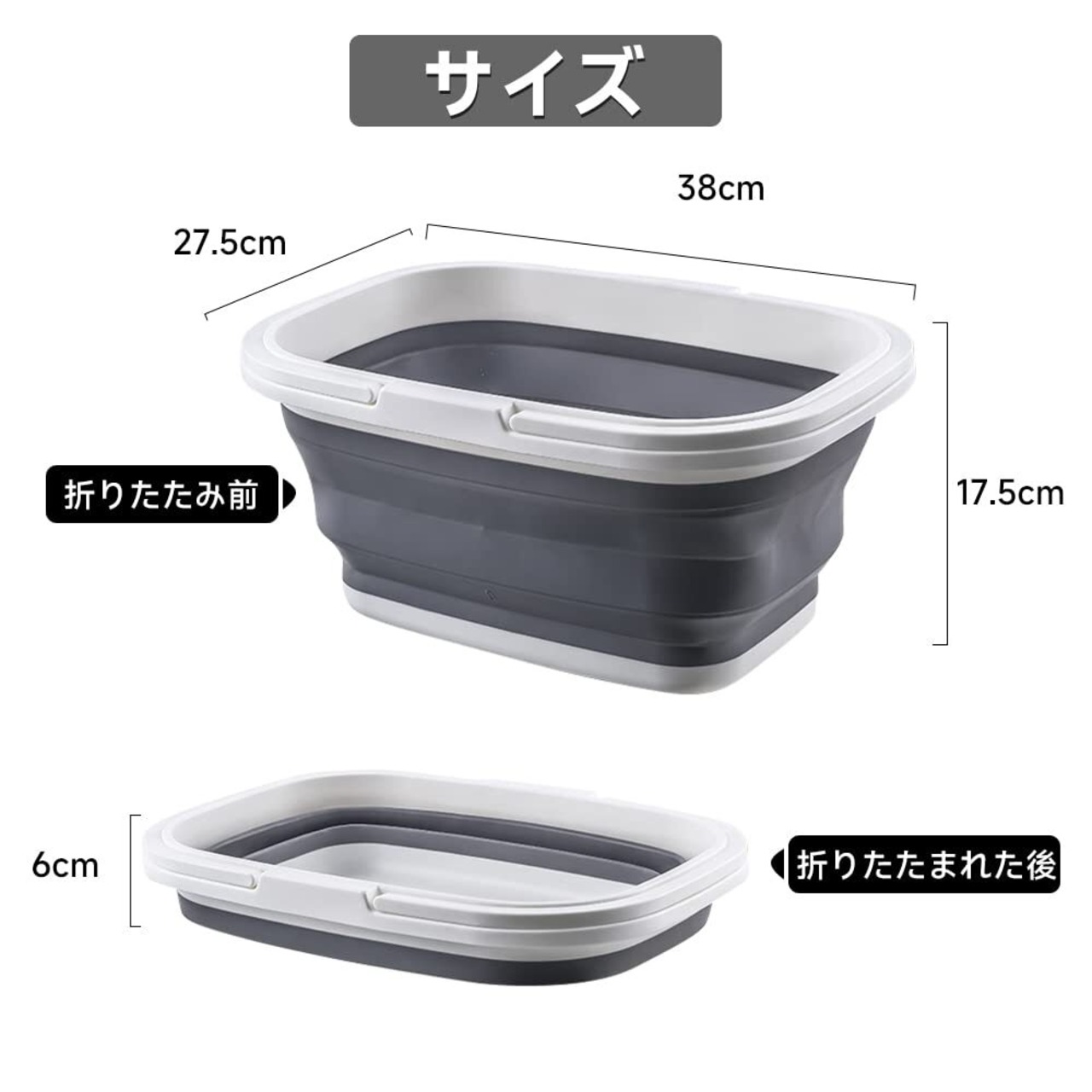 【仕樣】3色分け(グレー、ブルー、オレンジ)、展開サイズは38*27.5*17.5cm、折畳めるサイズは38*27.5*6cmです。重さは約0.6kg、満水容量は約10Lです。