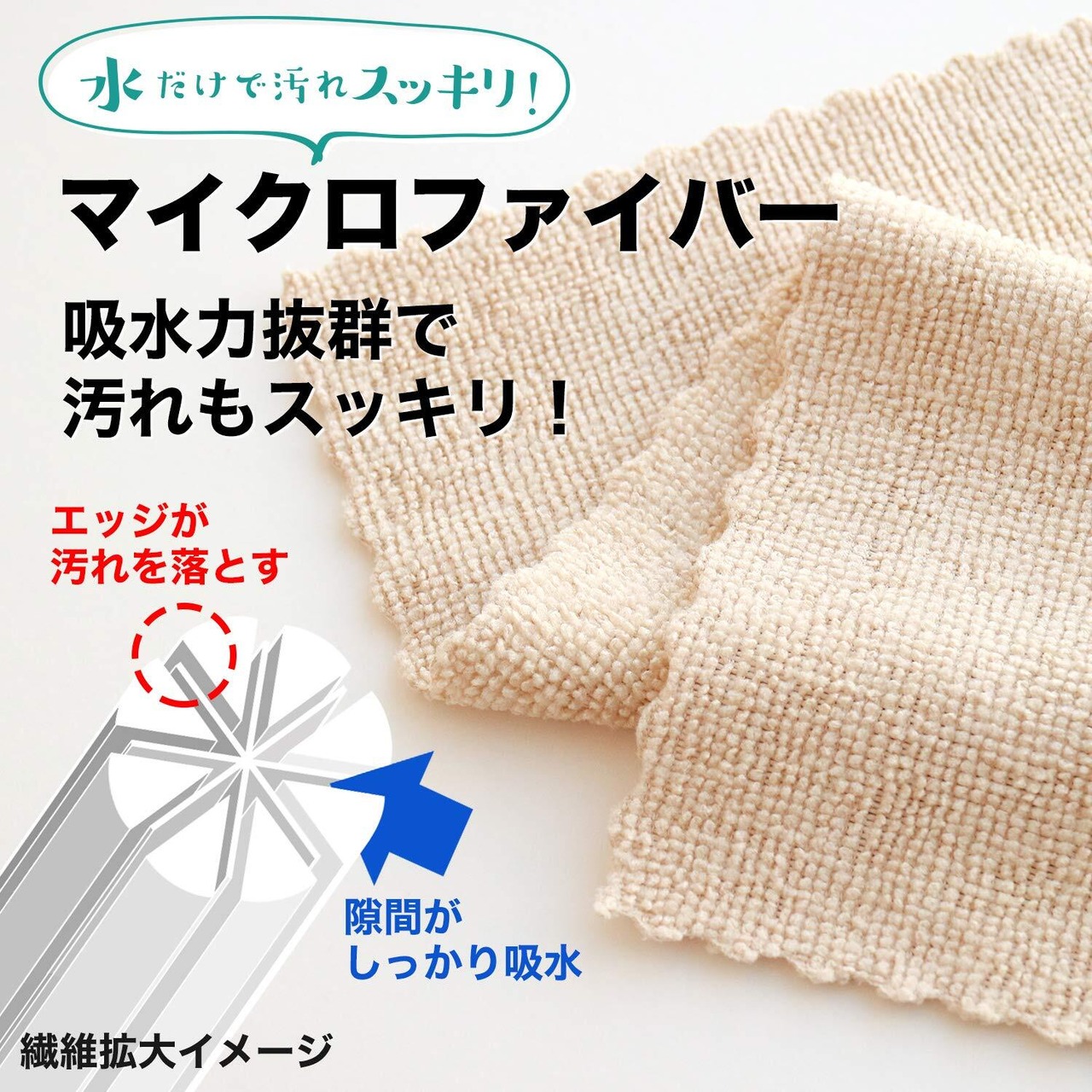 超極細繊維が油汚れやホコリなどをスッキリ落し、水滴をすばやく吸水します。