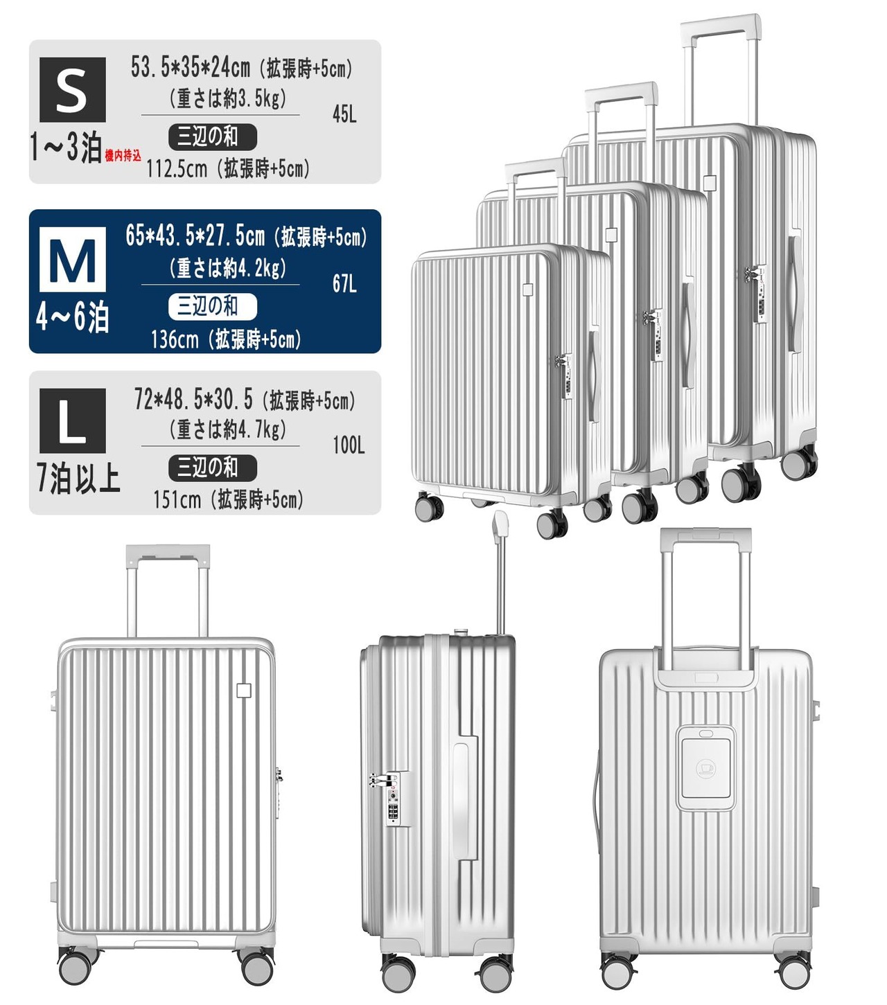 【片開き・拡張可能・大容量タイプ】片面開きなので狭い場所でも完全に開けずに出し入れが可能で、占有スペースを50%削減します、開けるときも片手で楽々。ファスナータイプで、マチ幅を5cm拡張するだけで容量が20%UPできる。旅先でお土産が増えても安心です。※拡張時は機内持ち込み不可