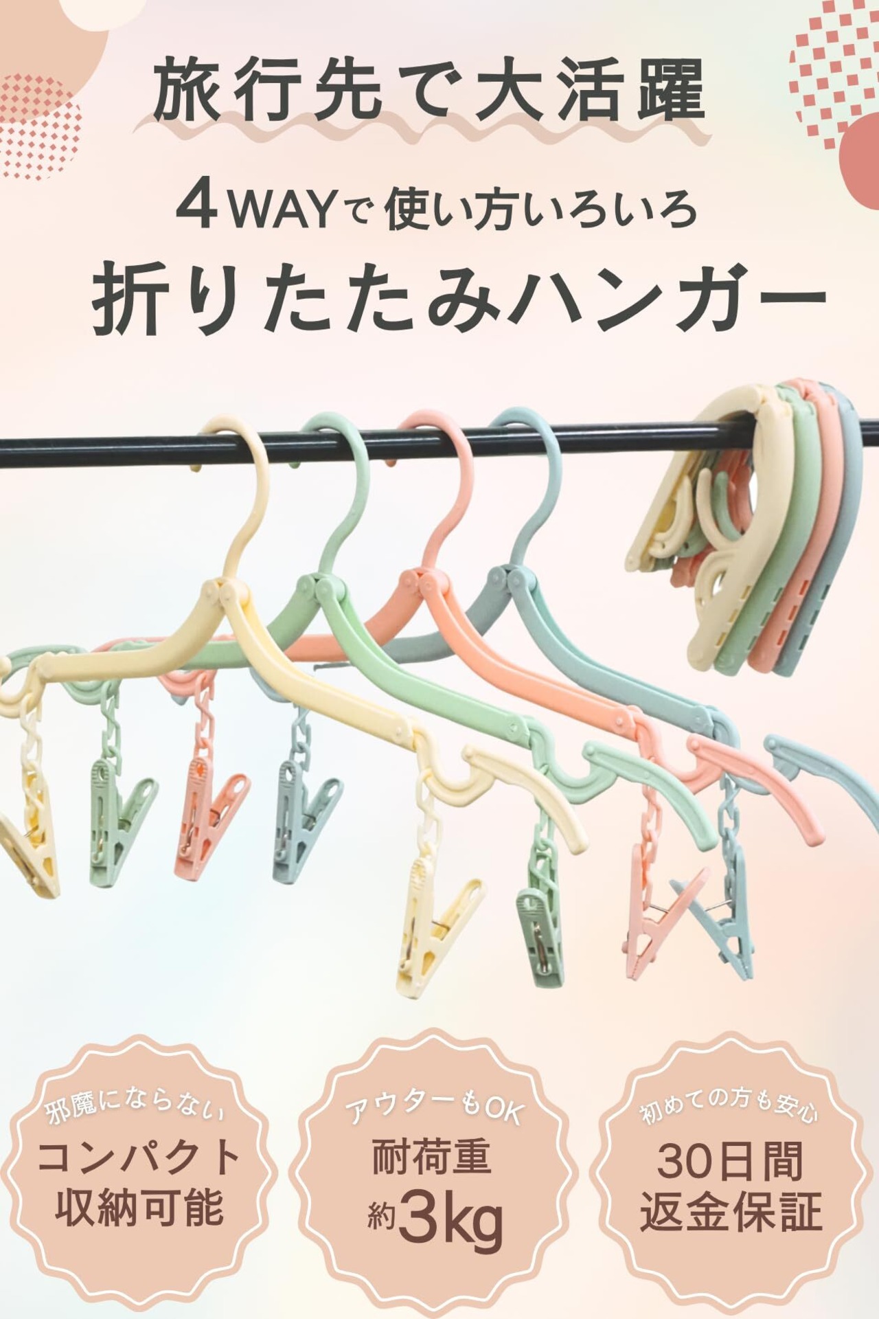 【旅行の新定番!コンパクトな4way折りたたみハンガー】 携帯ハンガー 4色 8個 折り畳み式 携帯用 洗濯ばさみ付き トラベル用品 洗濯物干し 旅行用 ピンチハンガー 海外旅行 入院 便利グッズ