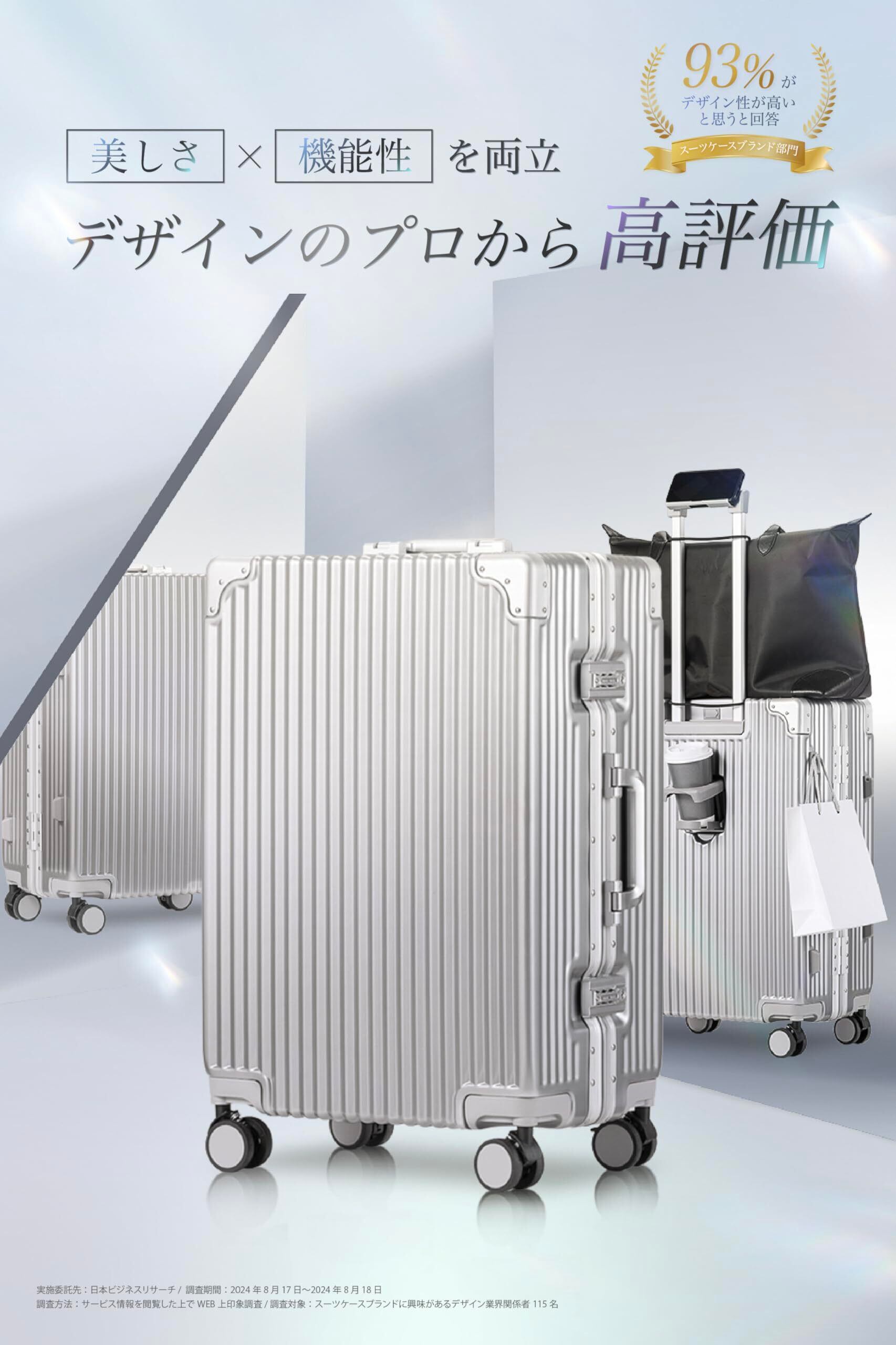 【新素材:ChromeLite】2年の開発期間を経て誕生した独自新素材「ChromeLite」をスーツケース本体に採用。金属のような高級感ある見た目を持ちながら、樹脂系ケースのように軽量で、堅牢性も兼ね備え、長く愛用できる仕様です。開閉部には、チャックタイプと比較して防犯性、耐久性に優れるアルミフレームタイプを採用。そのため海外渡航での使用も可能です。【高いデザイン性】C.jutroのスーツケースはデザイン関係従事者から高評価を頂いています。意匠権取得済 1764744 ※商品のコピー品にご注意ください。