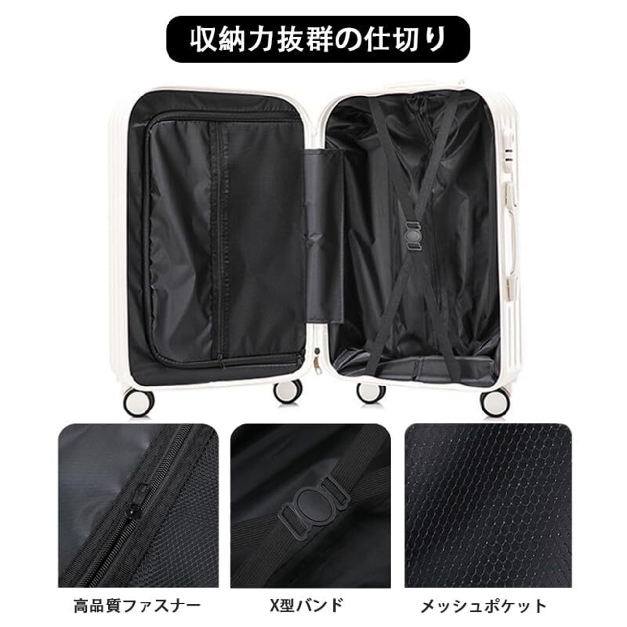 【カップホルダー&隠しフック】スーツケースには折り畳み式カップホルダーと隠しフックが装備しています。カップ、傘、コーヒーなどを入れることで、楽なjourneyを楽しめます。バッグや手提げ袋なども側面の隠しフックに掛けられます。更に手の負担を減らします。