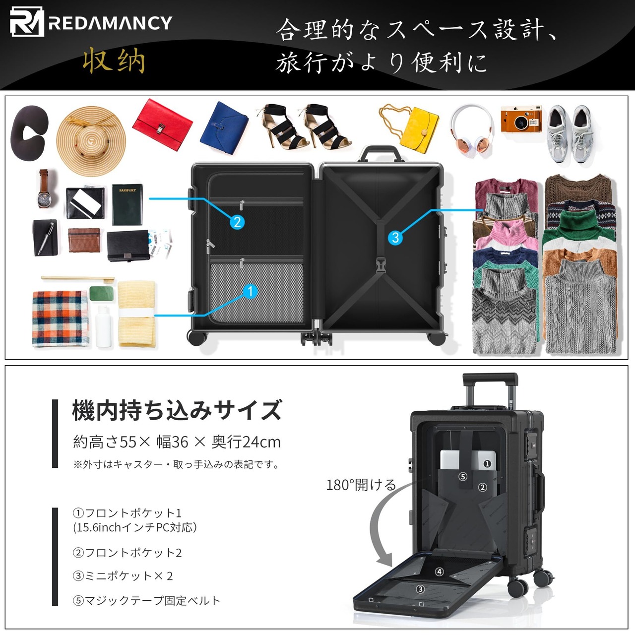 【2025最新】[Redamancy] 現役客室乗務員が設計を指導 スーツケース 機内持ち込み 【日本企業企画】 多機能フロントオープン キャリーケース ストッパー付き 携帯スタンド USBポート付き カップホルダー付き 隠しフック機能 超軽量 耐衝撃 静音 360度回転 ダブルキャスター アルミフレーム ピュアPC材質 大容量 TSAロック搭載 旅行 ビジネス 出張 (1-3泊 20インチ 42L ブラック)