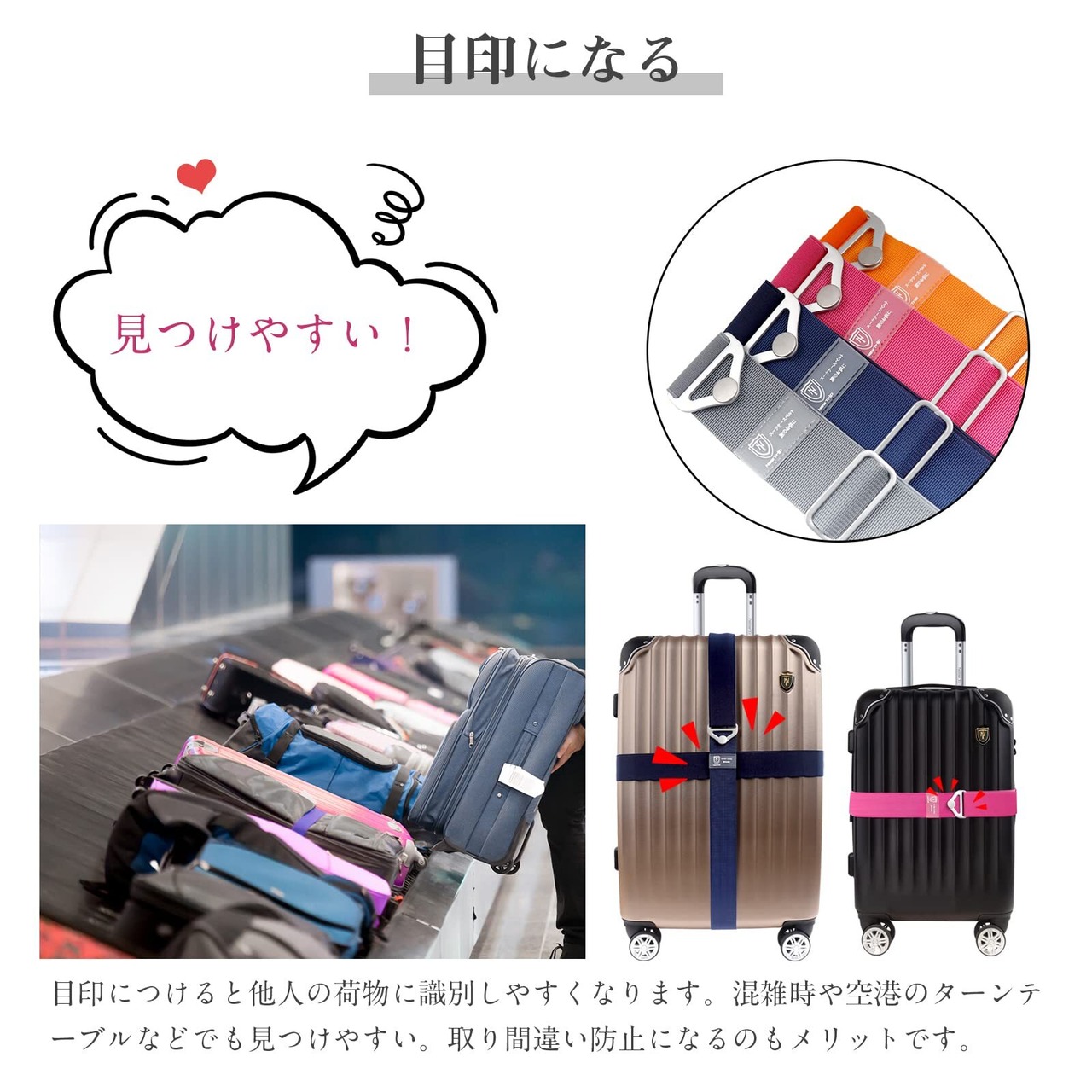 【スーツケースの目印になる】空港で預けたスーツケースを取りに行く際に困ってしまうのが、色や形が似ているスーツケースが多く自分のがどれかわかりづらいこと。スーツケースベルトを付けておくことで、 一目で自分のスーツケースを見つけることができます。また、他の人に間違われて持って行かれる心配も少なくなります。快適な旅行を楽しむために、スーツケースベルトをお勧めします。