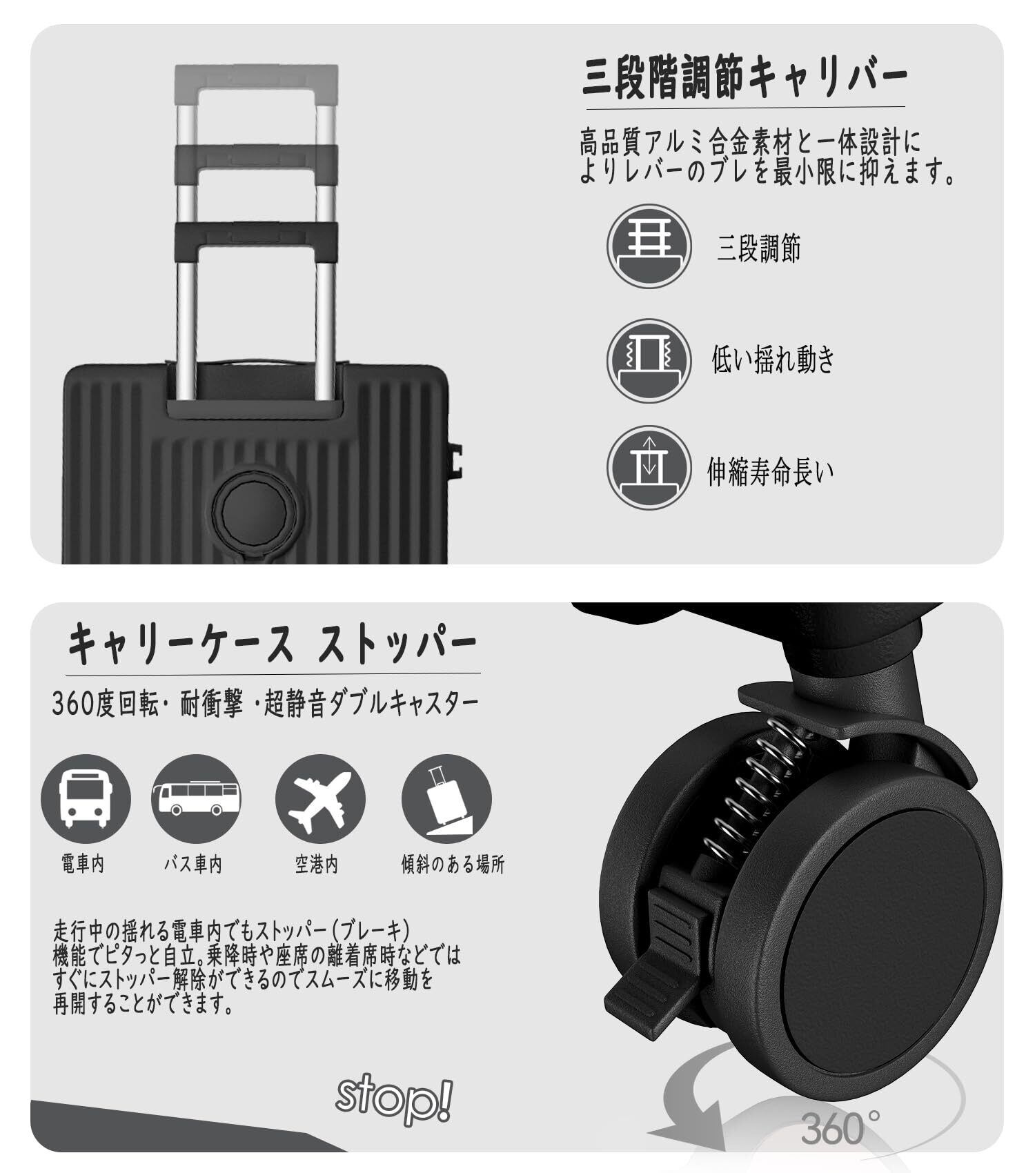 【360度回転 耐衝撃静音ダブルキャスター】高弾性TPE衝撃軽減素材のキャスターを採用し、より静かで耐摩耗性も向上しています。スムーズな滑りを実現しながら、360度の自由回転もできます。ダブルキャスターデザイン、旅先での移動をよりリラックスで快適になります。角部に硬質コーナープロテクトを追加、衝撃を効率的に吸収でき、より長くご利用いただけます。