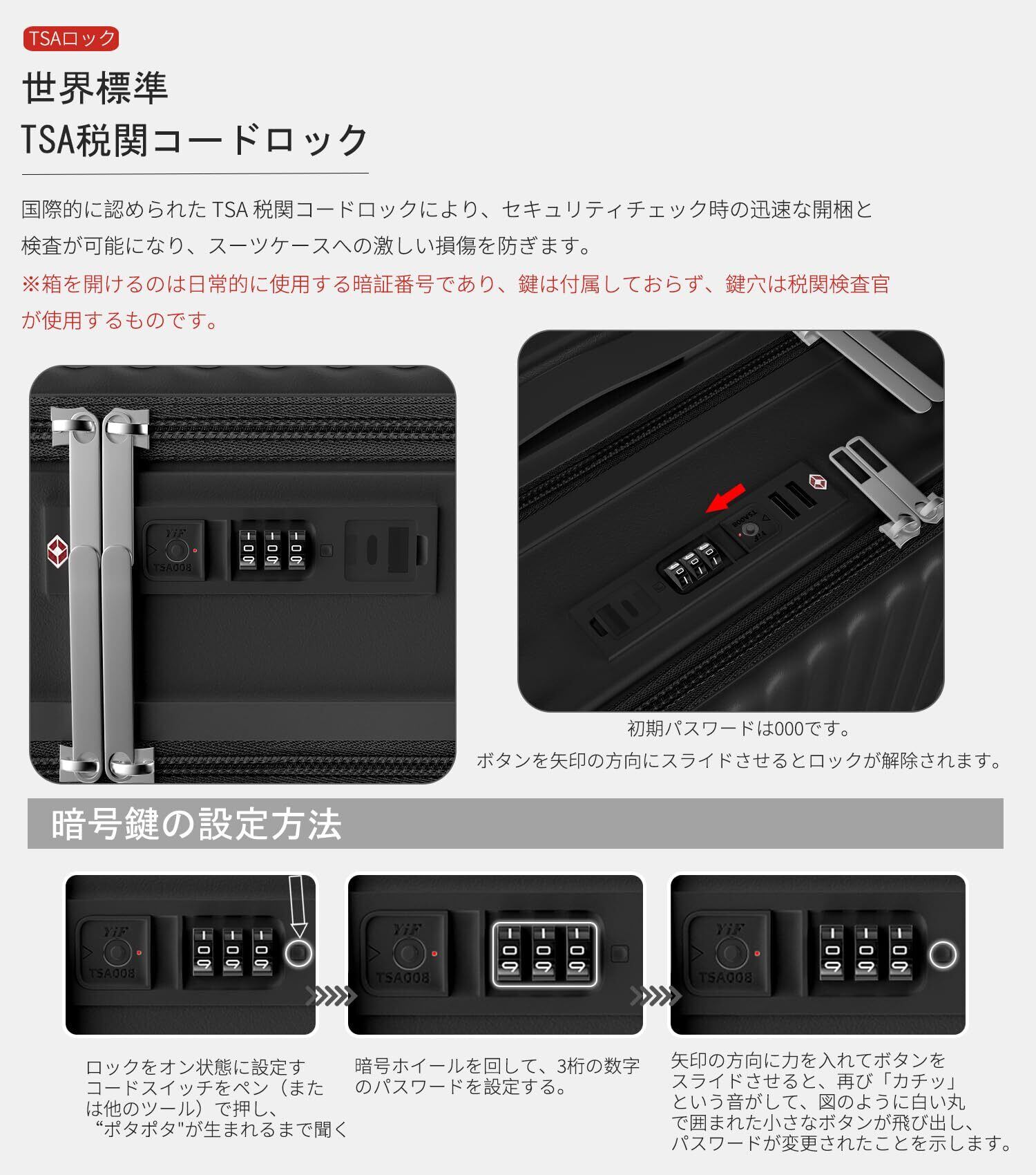 【丈夫かつ軽いPC素材&TSAダイヤル式ロック】表面素材は高耐衝撃性を持つPC(ポリカーボネート)を100%使用。高弾性で、変形しにくい。ABS素材を採用した市販品より頑丈で耐久性に優れ、ABS+PCスーツケースより軽量で持ち運びやすい。PC 素材は、現在市場で最も一般的に使用され人気のあるハードシェル ラゲッジであり、防水性、耐摩耗性、スタイリッシュさ、耐衝撃性、落下耐性を備えています。世界基準のTSAダイヤル式ロックが搭載されて、外出がより安全に。※鍵は航空会社検査専用のため本製品には付属しておりません。