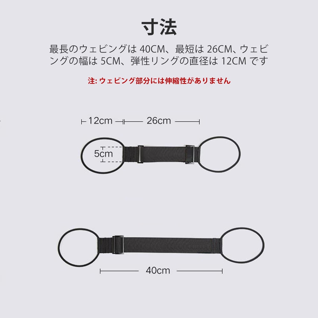【サイズ】 [幅]5 CM、ゴム部:[直径]12 CM、[ベルト部長さ]26~40CM(の間で調整可能)、[ゴム部込みの全長]50~64 CM。金具などがなく、バッグや荷物を傷つけることもありません。
