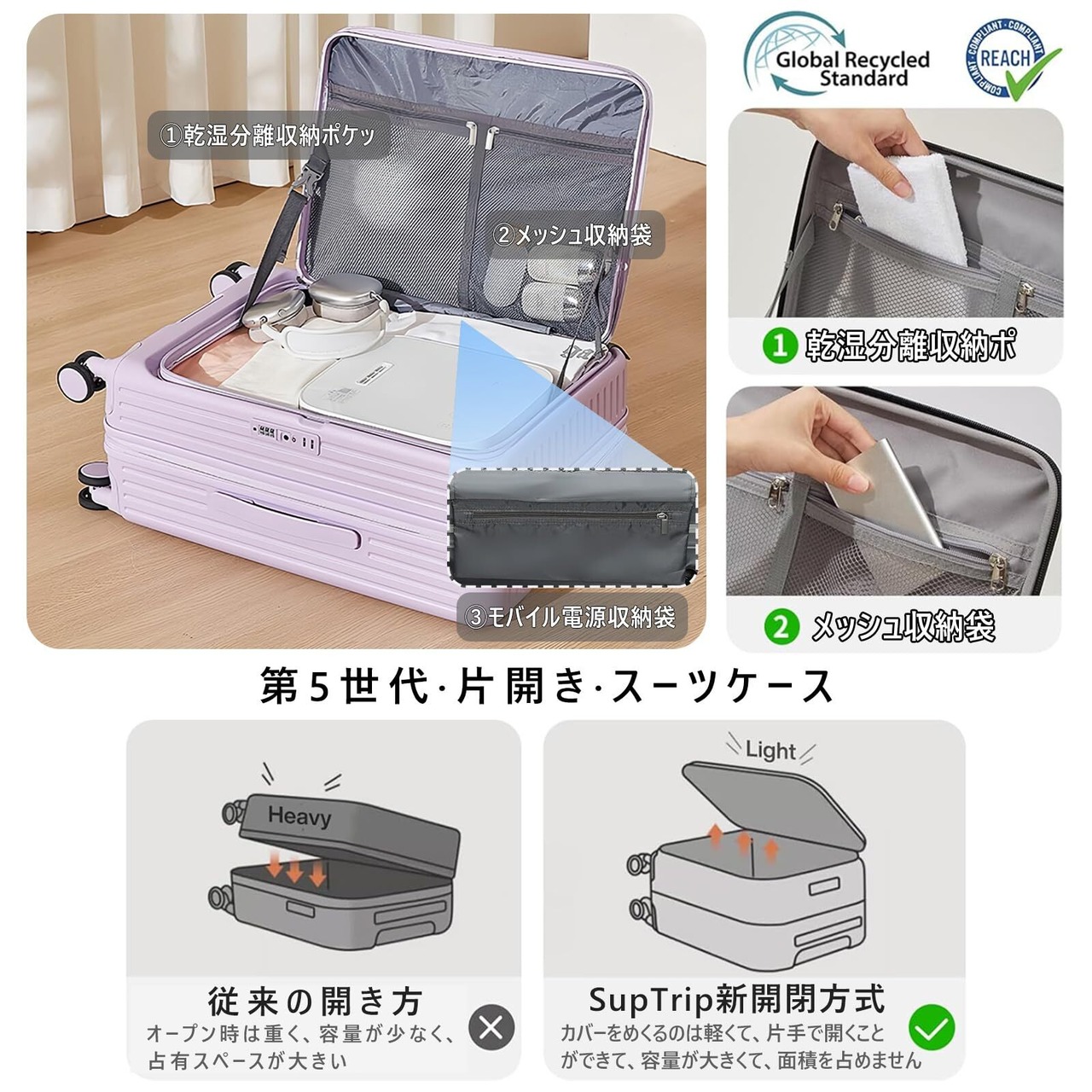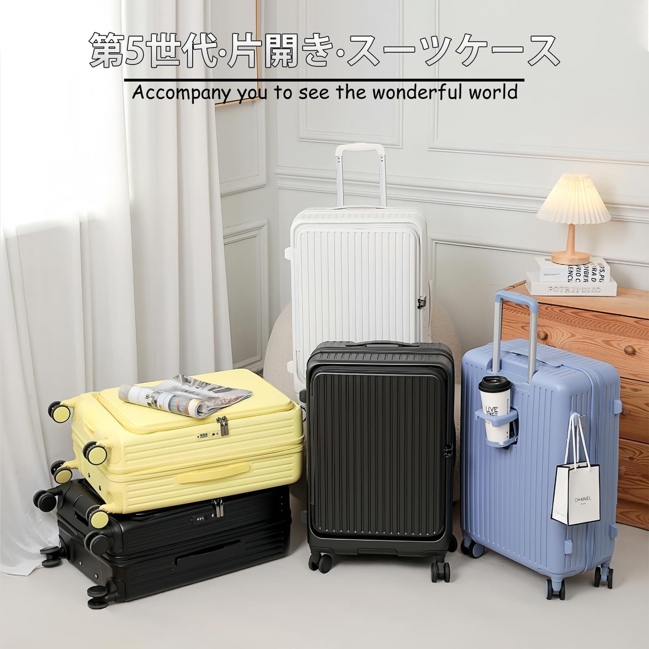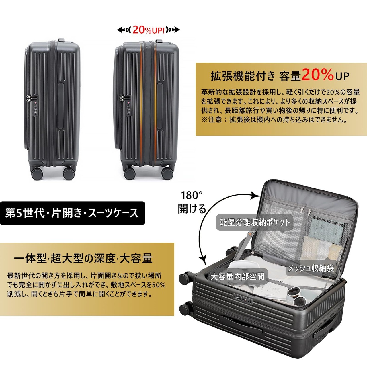 【第5世代·片開き·スーツケース】片面開きなので、狭い場所でも完全に開かずに荷物を出し入れでき、占有スペースが50%削減され、片手でも簡単に開くことができます。ファスナーを1周ひねるだけで容量が20%アップし、より多くの収納スペースを提供します。旅先での買い物など荷物が増えても安心ですし、急に増えた荷物にも気軽に対応できます。注意:拡張後は機内に持ち込めません。
