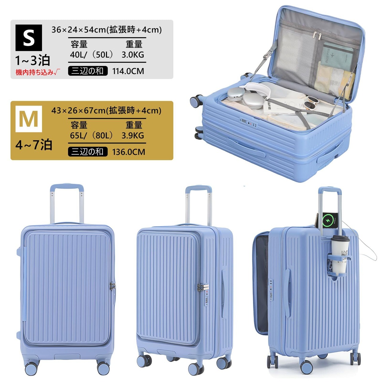 【人気商品】[SupTrip] スーツケース キャリーケース 多機能 片開き 拡張機能付き 機内持ち込み キャリーバッグ フロントオープン USBポート付き カップホルダー付き 隠しフック機能 超軽量 耐衝撃 静音 360度回転 大容量 TSAロック搭載 旅行 ビジネス 出張 (ブルー, S(1~3泊/40L/機内持込))