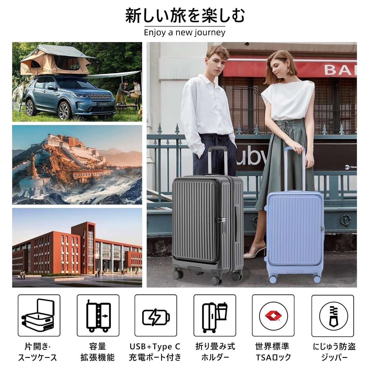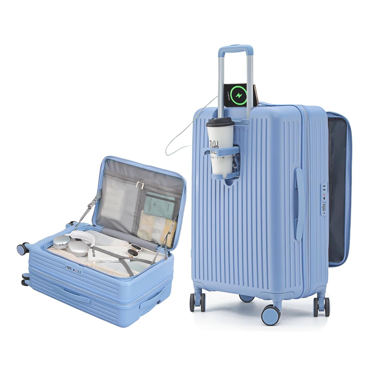 [SupTrip] スーツケース キャリーケース 多機能 片開き 拡張機能付き 機内持ち込み キャリーバッグ フロントオープン USBポート付き カップホルダー付き 隠しフック機能 超軽量 耐衝撃 静音 360度回転 大容量 TSAロック搭載 旅行 ビジネス 出張 (ブルー, S(1~3泊/40L/機内持込))