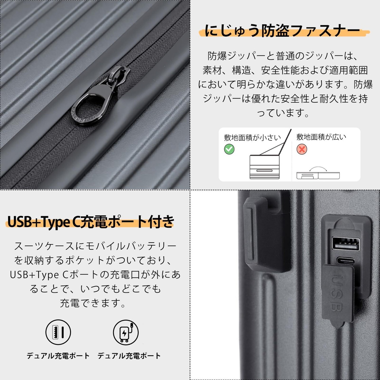 【多機能・USB+Type C充電ポート付き ・カップホルダーとスマホルダーを付く】スーツケースにモバイルバッテリーを収納するポケットがついており、 USB+Type Cポートの充電口が外にあることで、いつでもどこでも充電できます。便利な折りたたみ式ドリンクホルダー付き。バックカップホルダー、ミルクティーカップ、傘いつでも配置でき、旅行をより便利にすることができます。レバーの上部にはスマホルダーが付いているので、フライトの待ち時間に両手が自由になり、外出先でもリラックスできます。