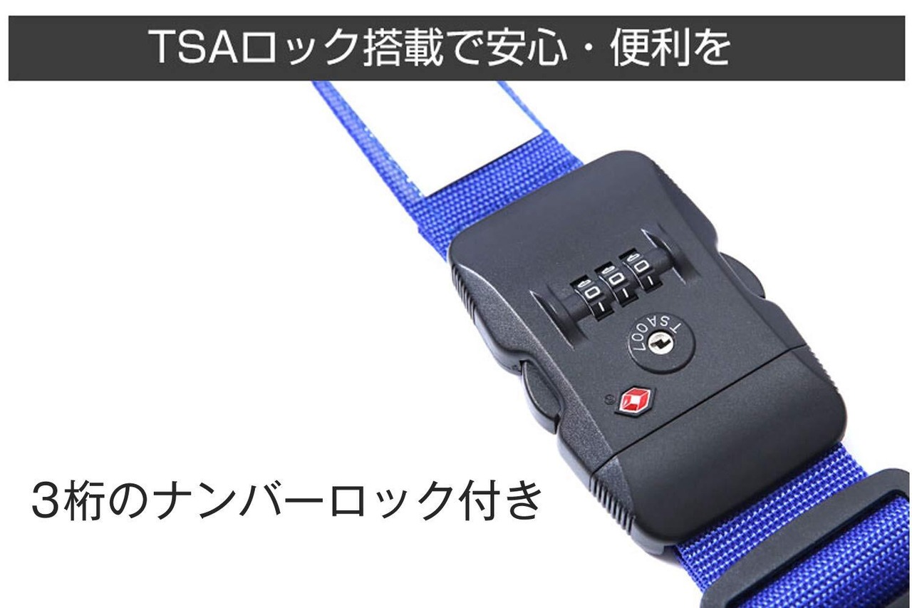 【安心のTSAロック】スーツケースを預けた後、衝撃などで万が一口が開いてしまった場合やスーツケースが破損しまった場合、中の荷物が飛び出す可能性があります。そんな時にはこのスーツケースベルトがあれば防止することができます。TSAロック付きなのでセキュリティの厳しいアメリカやイギリスなどへの海外旅行も安心。国によってはTSAロックがついていないとベルトが破壊されることもあるので、必ず欲しい機能です。