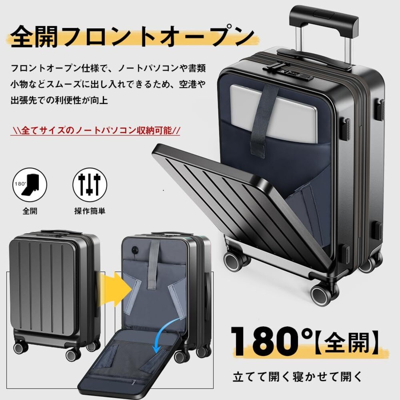 【スーツケース フロントオープンで取り出し簡単|Sサイズ機内持ち込み対応】 PCや書類、小物類をスムーズに取り出せるスーツケース フロントオープン構造を採用。移動中や空港のセキュリティチェック時でもすぐにアクセス可能。スーツケース 拡張機能付きながら、コンパクトで機内持ち込みサイズにも対応。仕事用のキャリーケースとしても最適で、急ぎのビジネス対応や通勤にも使える多機能キャリーバッグです。要注意:拡張前のSサイズは機内持ち込み対応(※航空会社によって異なる)
