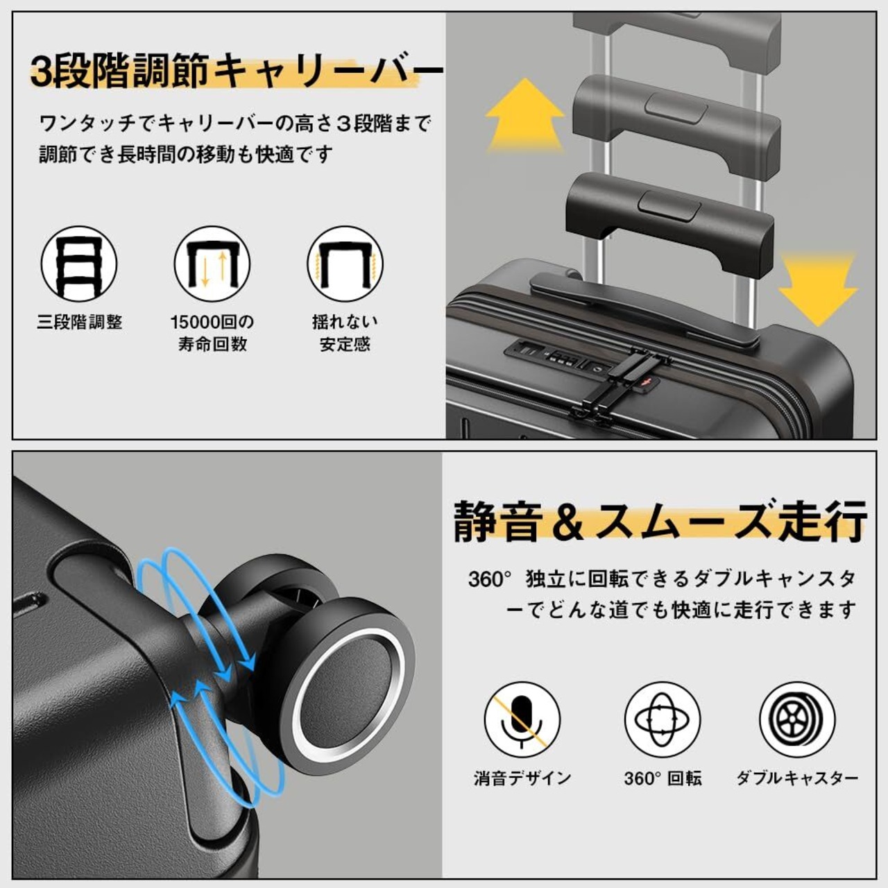 【静音ダブルキャスター・超軽量設計|スムーズな操作性】 360度回転する静音ダブルキャスターと軽量設計で、移動時のストレスを大幅に軽減。人混みの中や段差のある場所でもスムーズな走行が可能です。スーツケース 拡張機能付きでありながら、持ち運びやすさを重視。スーツケース フロントオープンタイプで、機能と操作性を両立させた優秀なキャリーバッグ・キャリーケースです。