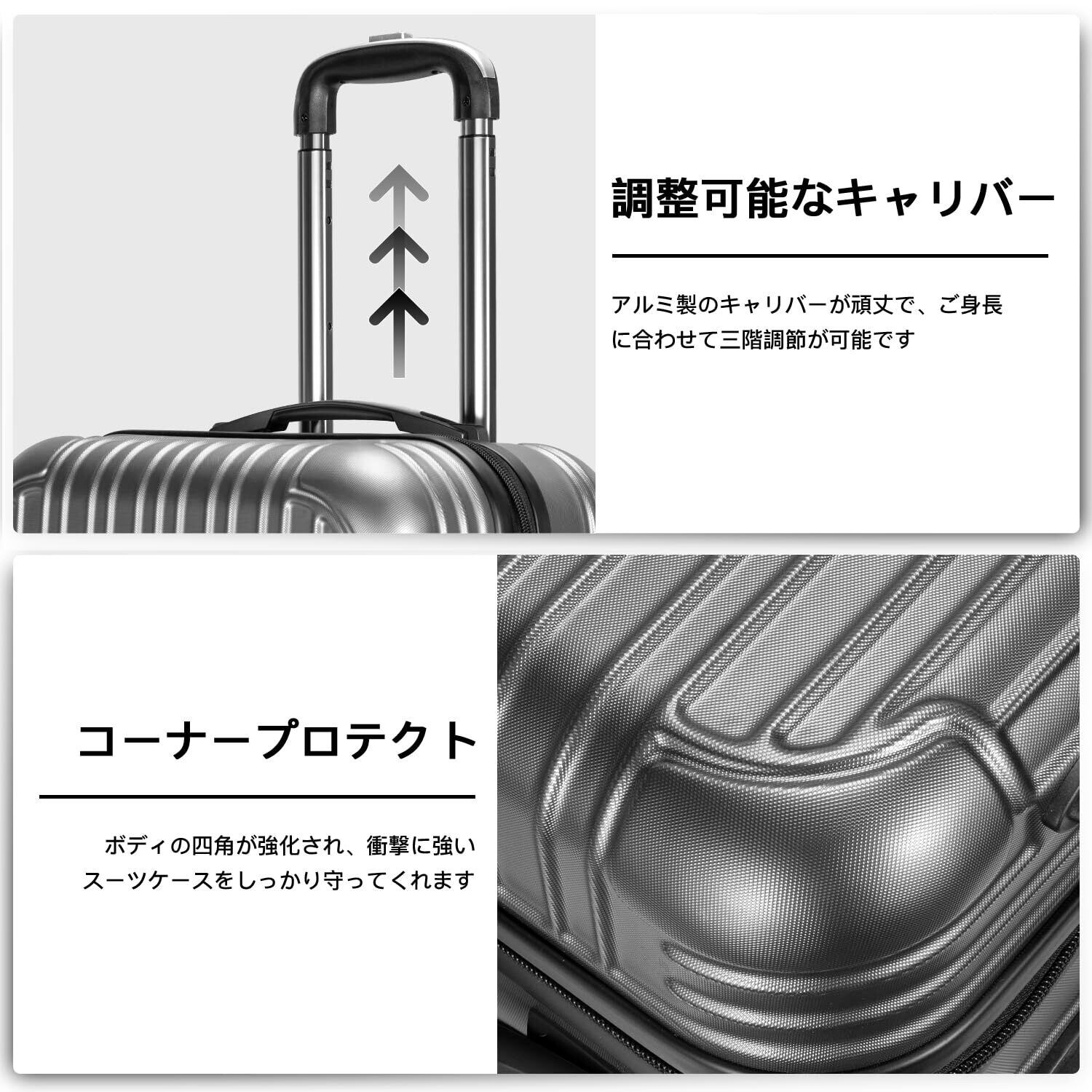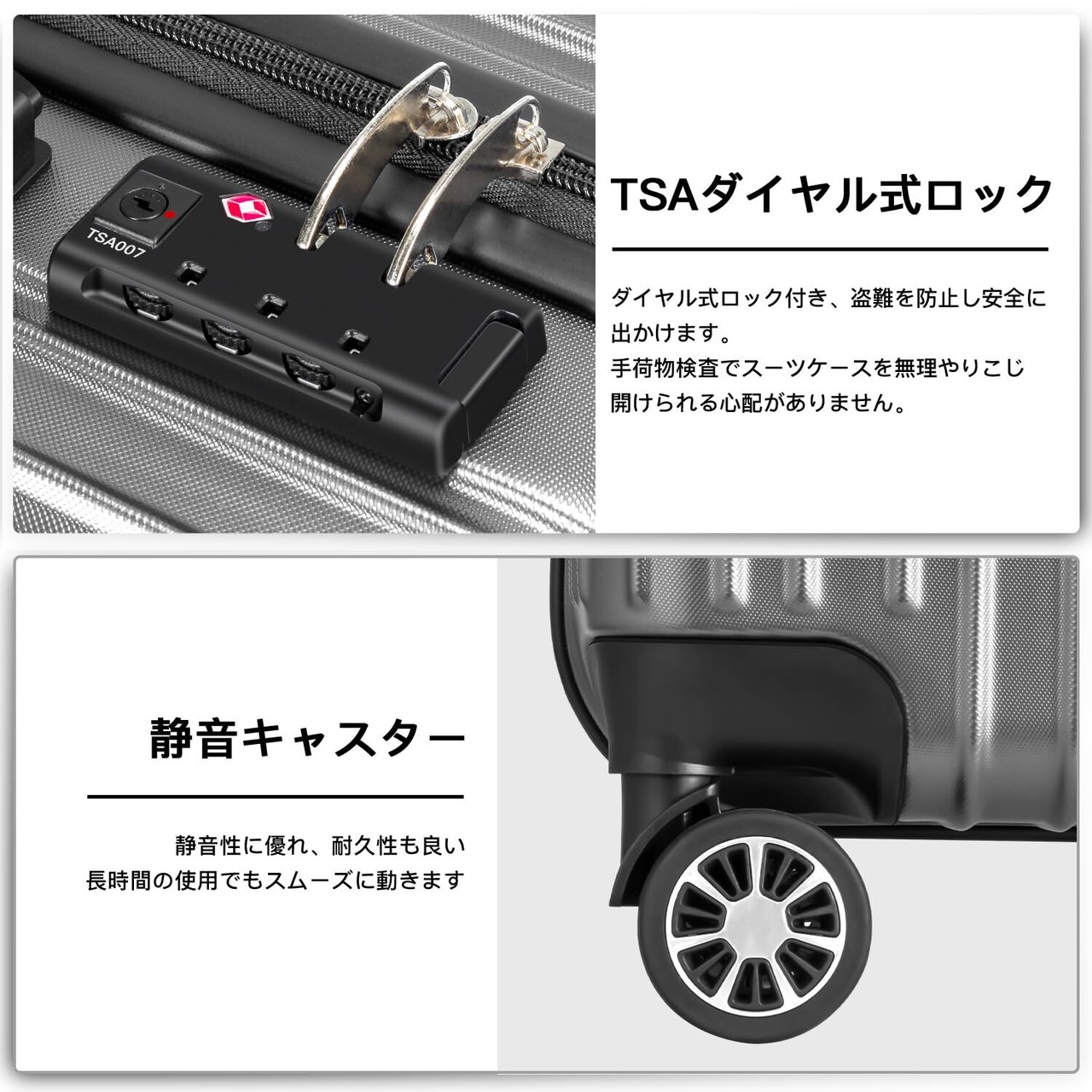 【材質&TSAダイヤル式ロック】スーツケースはABS樹脂とPCでの混合素材で作られ、耐衝撃性に優れた上、高弾性で、変形しにくい。エンボス加工、傷つきにくい。アルミフレームスーツケースより軽量で持ち歩きやすい。TSAダイヤル式ロックが搭載されて、外出がより安全。また、鍵穴は航空会社検査専用の物です。本製品に鍵は付属しておりません。