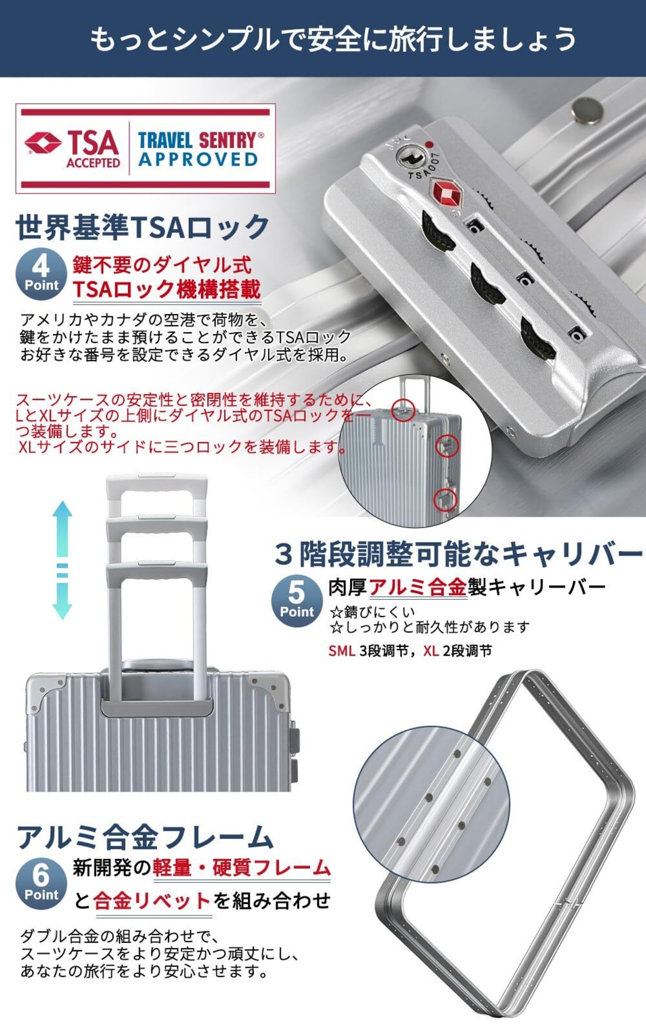 【注意】①TSAロックには鍵穴がありますが、鍵は付属しません。②スーツケースのサイドにロックを装備する数量:S/M/Lは二つロックがあります。 XLはスーツケースの安定性と密閉性を維持するために、サイドに三つロックを装備して、上も一つロックを装備します。 【頑丈なボディ:ABS+PC素材】スーツケースは、ABS樹脂とPCの混合素材を使用しているため、軽量でありながら耐衝撃性に優れています。また、ベーシックなデザインなのでビジネスやカジュアルなシーンで使用することができるのも便利ですね。どんな旅行や出張にも活躍できます。