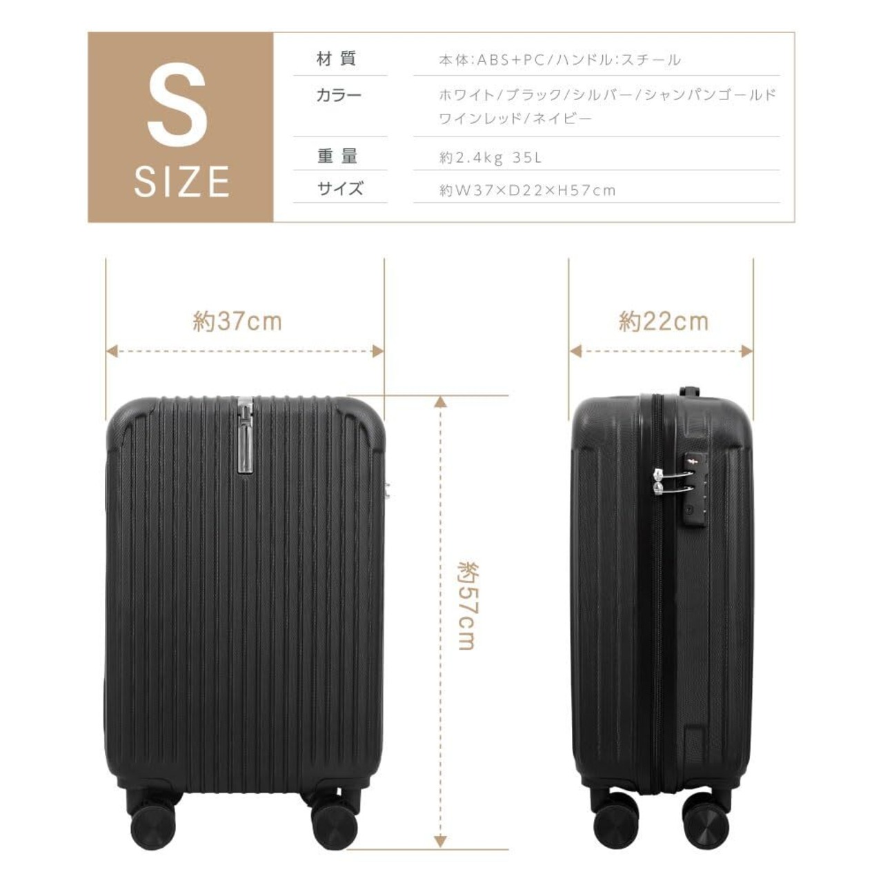 【製品仕様】サイズ:約W37×D22×H57cm / カラー:ブラック / 重量:約2.4kg / 容量:約35L / 材質:ABS+PC(本体)、スチール(ハンドル)