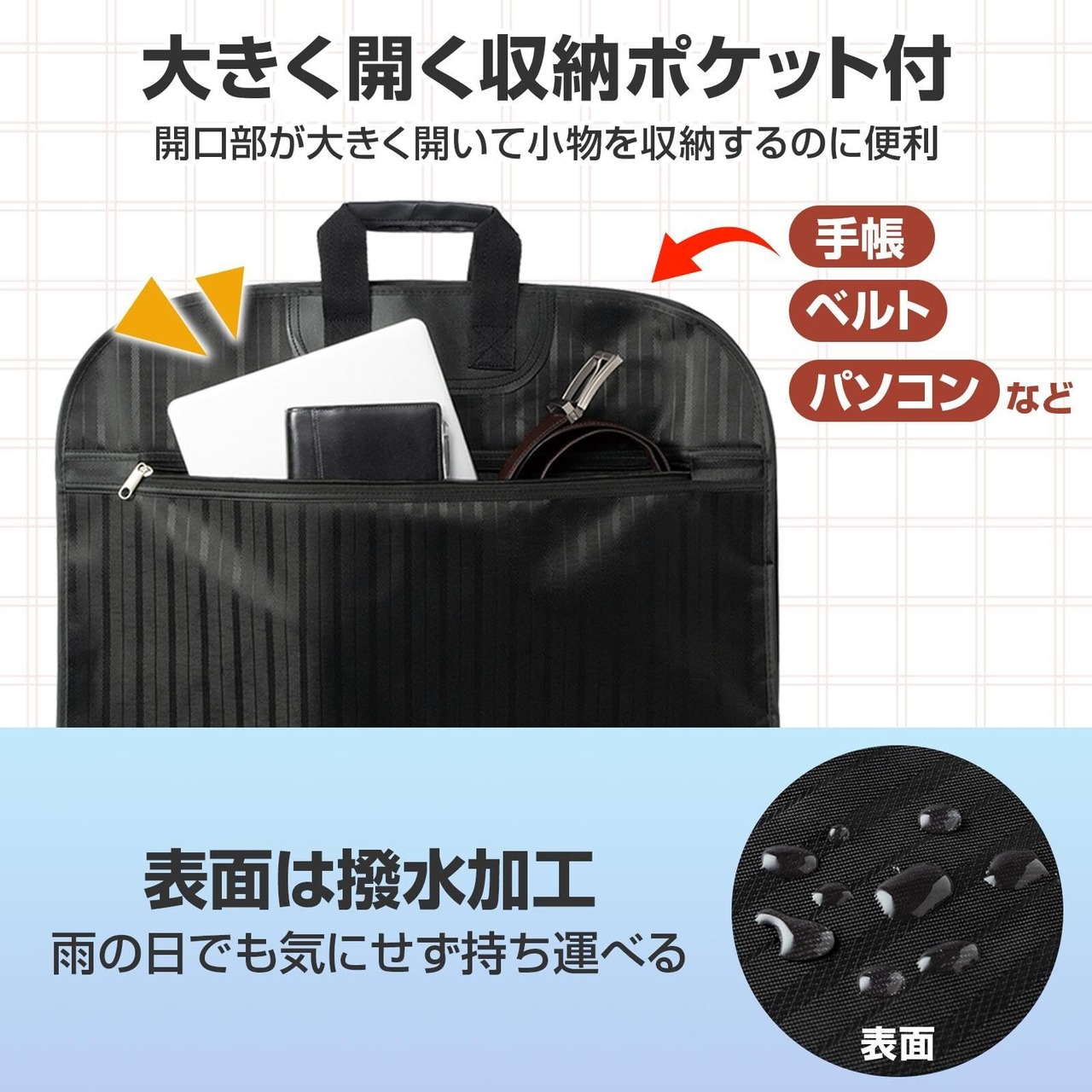 冠婚葬祭や出張で大活躍◎小物を収納できるポケット付きで表面は撥水加工が施され、雨の日も気にせず持ち運べる。
