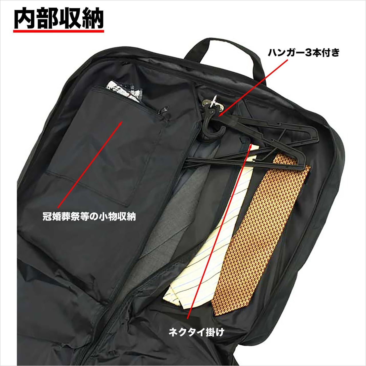 正面と内部にはファスナーポケットを複数装備しており、ワイシャツやネクタイ、靴下、ベルトなど、スーツ周りの小物の収納にも便利です。