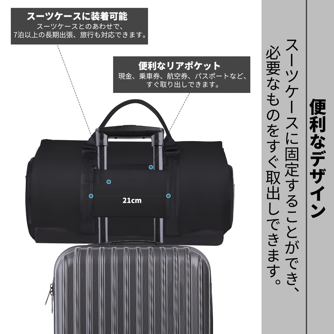 【3in1の一式収納バッグ】ガーメントケースとボストンバッグの組み合わせ!「ハンドバック」+「ショルダーバック」+「キャリーオンバッグ」一体型のガーメントケースです。取り外し可能のショルタ一ベルトが付属し、スタイルに合わせた使い分けが可能で、ショルダーバックとしても便利です。持ち手は握り易いハードタイプのハンドルで、手のひらにすっぽり収まる大きさ、しっかり芯材も入っており握り易さを重視する。背面にはキャリーケースに取り付けられるように設計し、手に持たなくても持ち運べる仕様に。キャリーケースの持ち手幅に合わせたサイズで作られ、移動中も安心して持ち歩き可能!