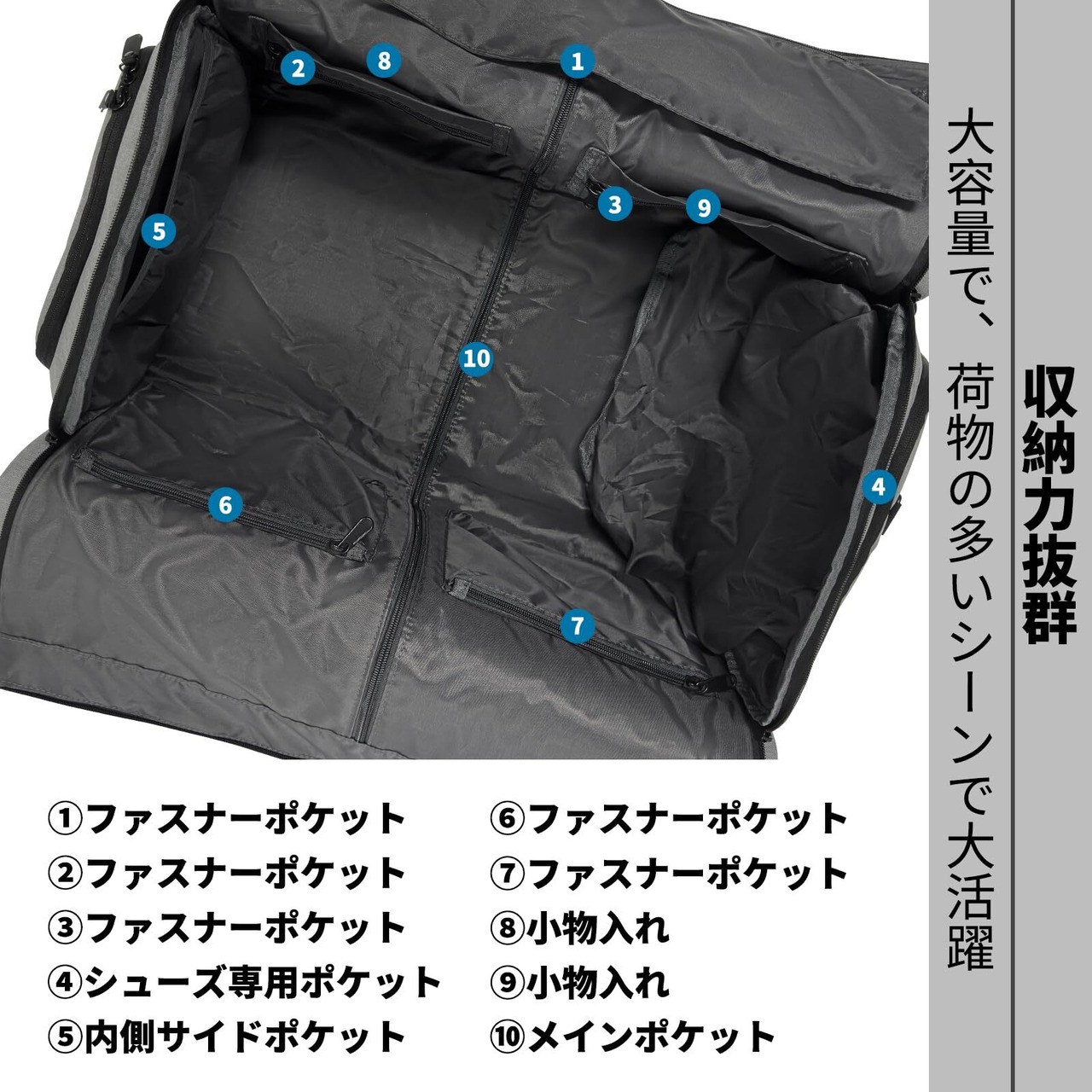 【靴収納可能&安心な20ポケット】サイズ:横55cm×縦30cm×幅26cm(展開時:約103cmx50cm) / 靴ポケットの寸法:長さ30cmxマチ26cm / ベルト長さ:79~136cm(調節可) / 外ポケット:フロントポケット×3、シューズ収納ポケット×1、サイドポケット×1(小物入れ*2、ペンポケット*2)、リアポケット×1 / 内ポケット:メインポケット×1、スーツ専用コンパートメント×1、ファスナーポケット×5、小物入れ×2、内側サイドポケット×1。