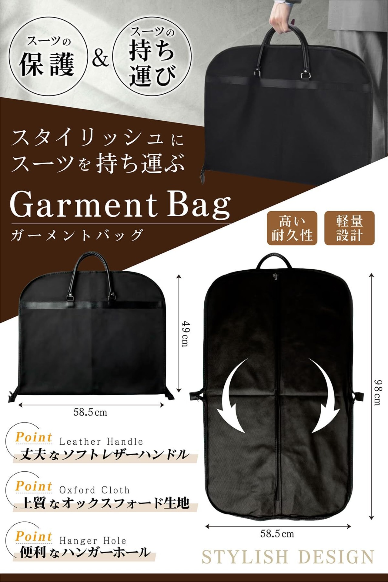 オックスフォード生地・ガーメントバッグ(Oxford Polyester Garment bag) スーツ バッグ 軽量 防水 スーツカバー 冠婚葬祭 ビジネス 出張 出勤 ガーメントケース 礼服 撥水 メンズ ケース 丈夫 (レザーブラック)