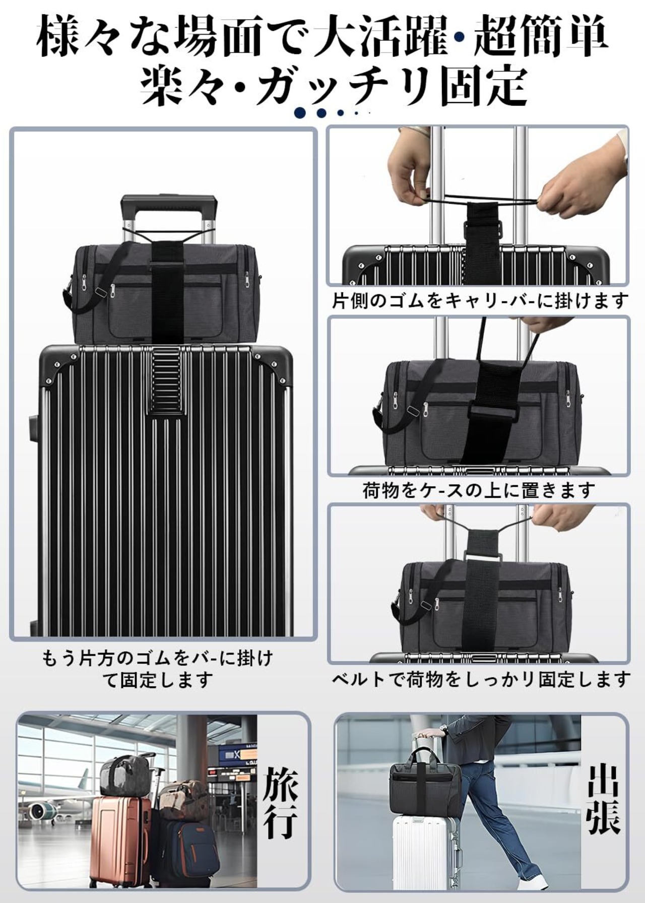 【利用シーン】旅行、出張、引いて越える、アウトドアキャンプなどの場合は、トラベルバッグ・キャリーバッグに荷物を簡単に固定することができます。旅行用キャリーに使用可能です。国内旅行海外旅行電車飛行機の移動時にカスタバークを持っていくときに役に立ちます。使わないときは畳で旅行バグの中にしておくためのコンパックさも人気の秘密です。