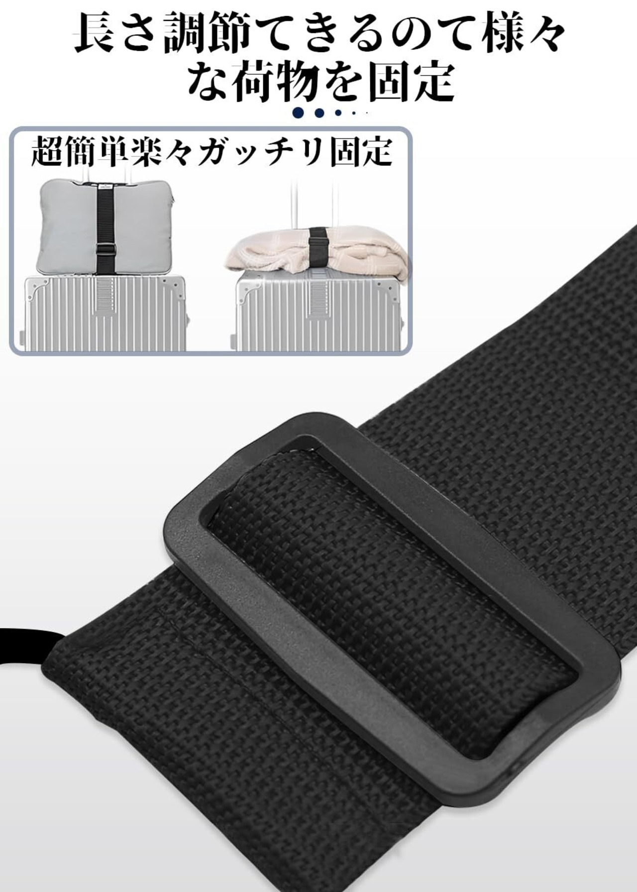 【製品特徴】ブロードバンドナイロン素材が作成されました、耐久性・耐摩耗性があります。金具をABS樹脂に変更し、軽量化とバッグなどを傷つけにくくなりました。スーツケースの上に手荷物をがっちりホールドできる機能ベルト。長さ調節もスムーズに行えます。キャリーの上に荷物を載せてもズレ落ちない 便利 旅行グッズ トラベルグッズ です。
