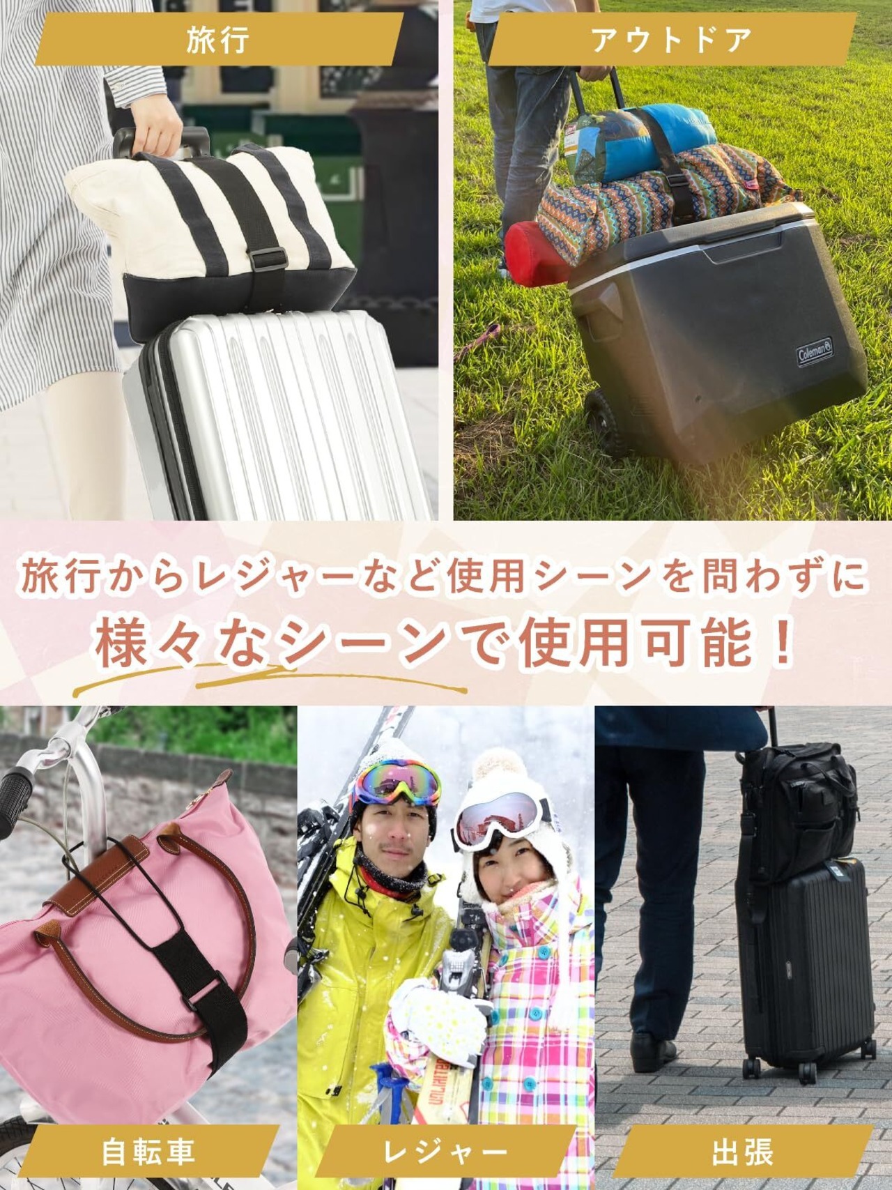【利用シーン】トラベルバッグ・キャリーバックに荷物をとても簡単に固定することができます。 ほとんどのスライドハンドル付旅行用キャリーに使用可能な優れもの。出張 国内・海外旅行 電車 飛行機 移動時に キャスターバッグを持っていくときに役に立ちます。また、アウトドアの際にクーラーBOX上に荷物を載せた移動などでも活躍します!