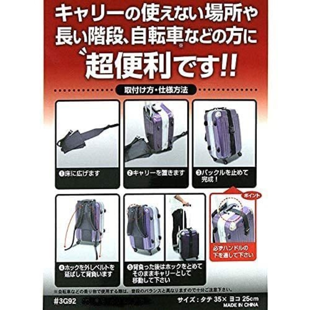 ベルトを回して留めるだけ(※必ずハンドルの下を通してください) これだけでリュックのようにキャリーケースを背負えちゃいます!今まで駅まで自転車で行っていた方も これがあればスーツケース、キャリーバッグも楽々背負って行くことができます。