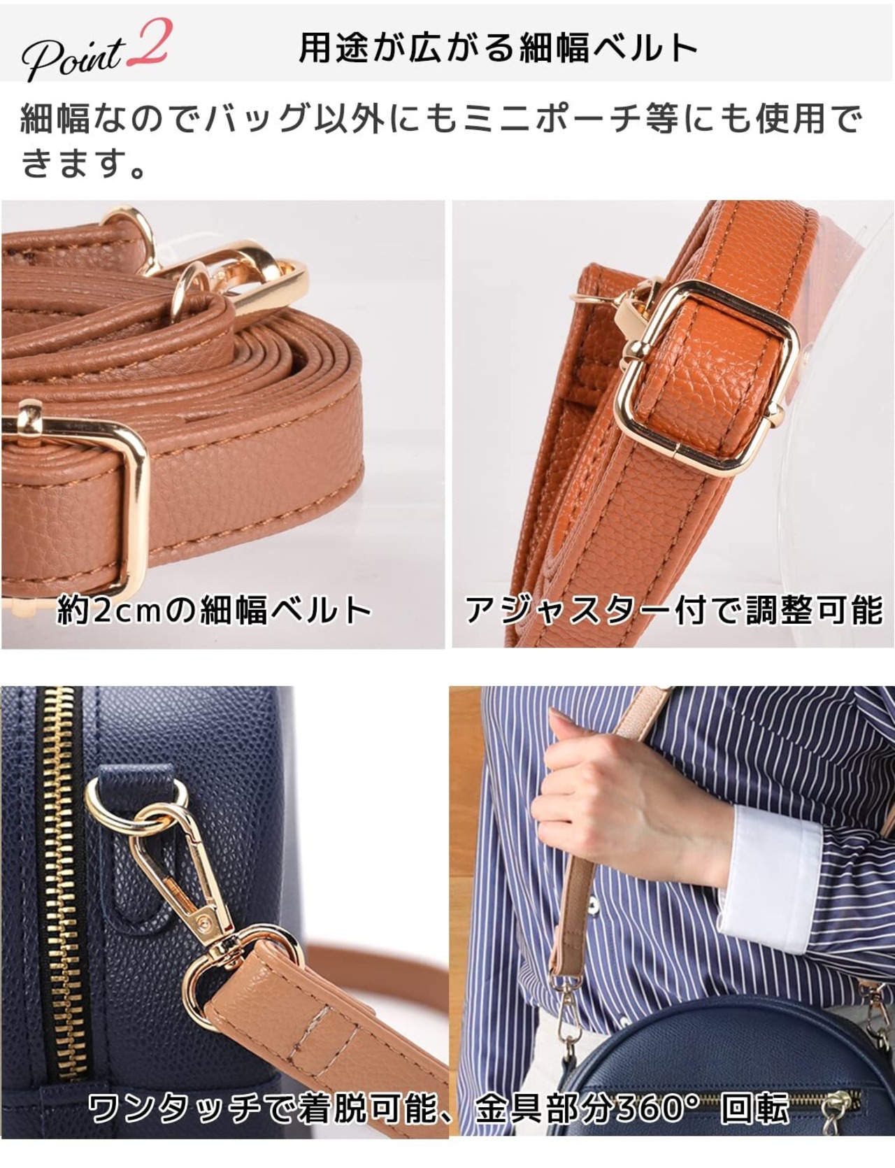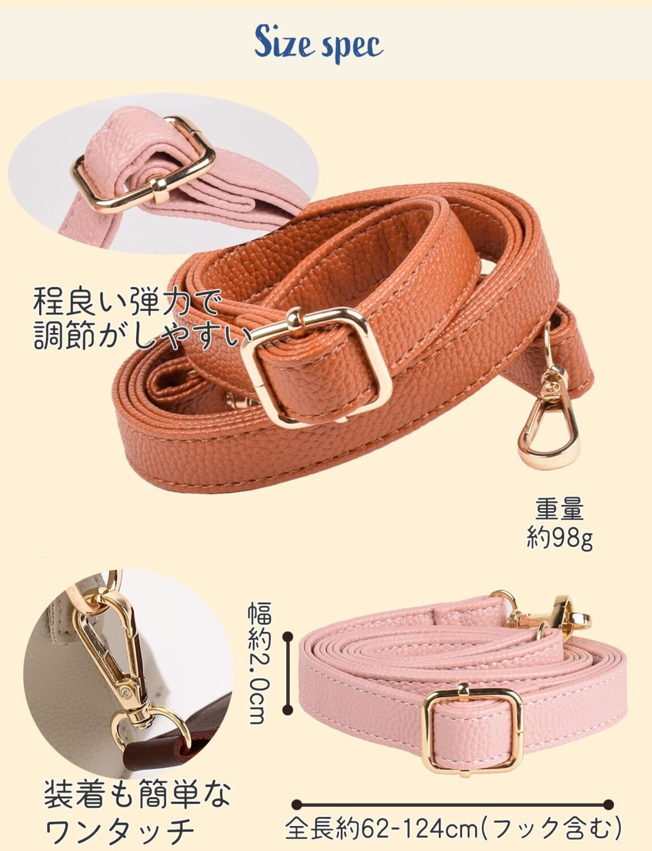 ショルダー紐長さ約62~124cm(フック含む)、ベルト幅約2.0cm、厚み約5mm、重さ約98g、合成皮革素材