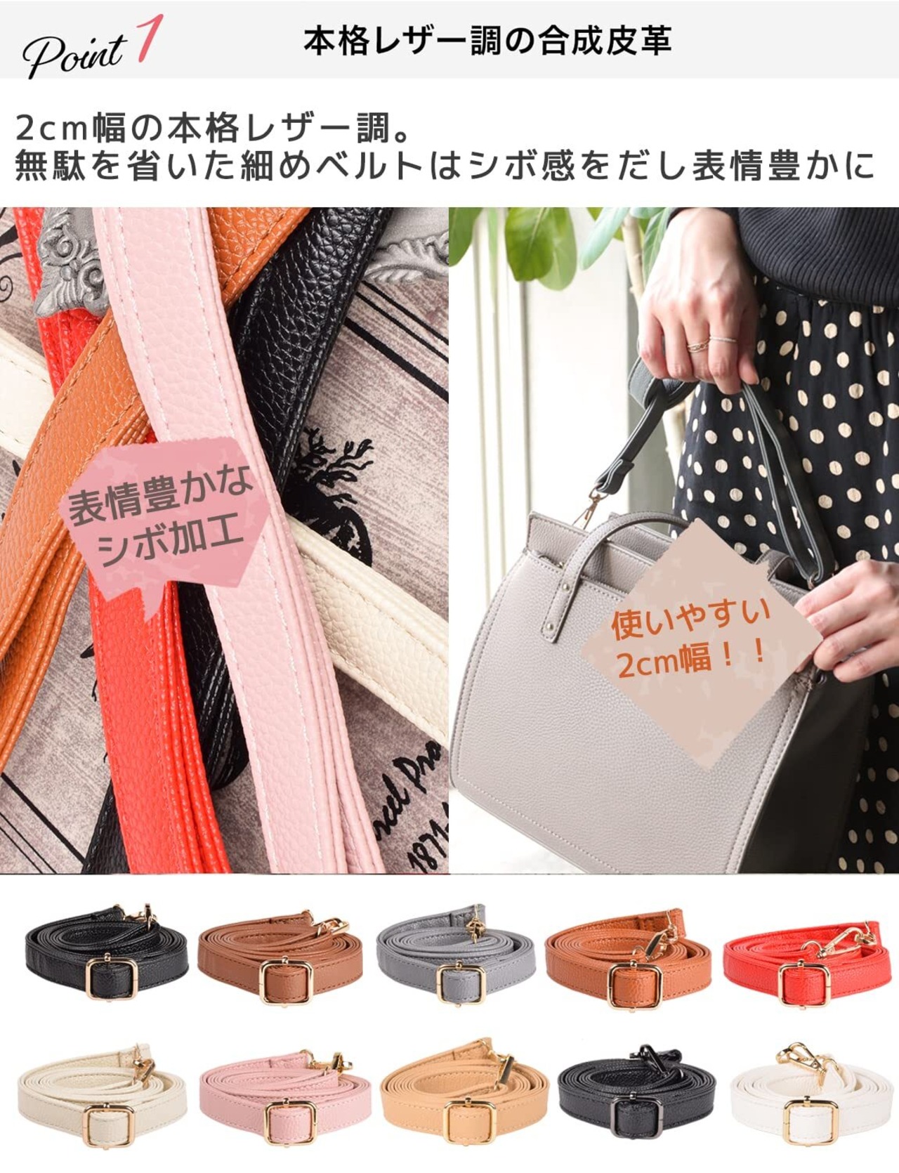 革部分にシボ加工を施し、表情豊かな使いやすい2cm幅のベルトはバッグやポーチと相性抜群。
