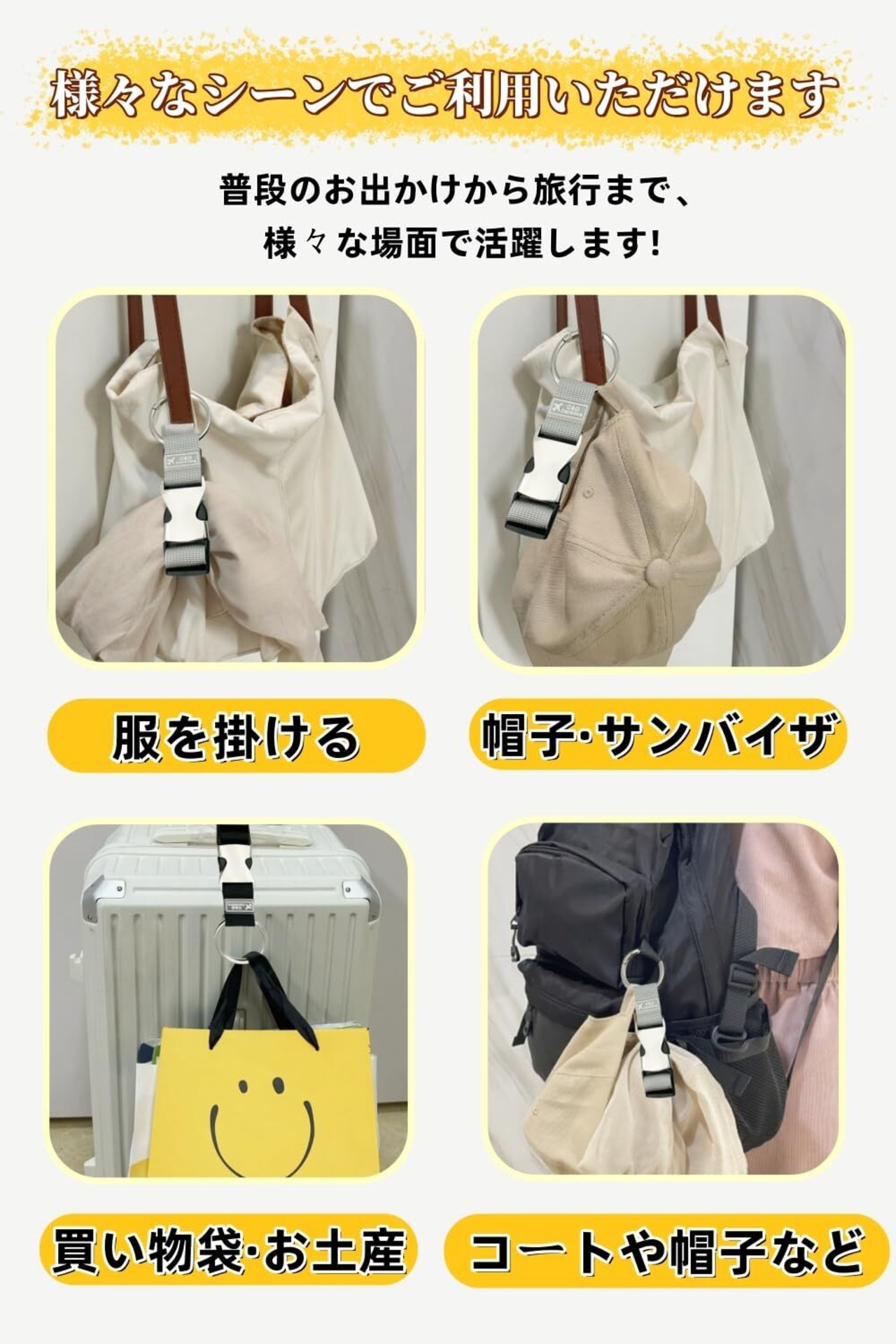 【幅広い用途】このベルトは、トロリーケースに荷物を取り付けることができ、旅行やビジネスの際によりリラックスした時間をお過ごしいただけます。ハンドバッグ、荷物、ブリーフケース、カートなど、さまざまなバッグに対応しており、出張や旅行、季節の変わり目に重宝すること間違いありません。また、このベルトは両手を解放することができますので、ジャケットやマフラーなどを簡単にバッグやスーツケースに取り付けて持ち運ぶことが