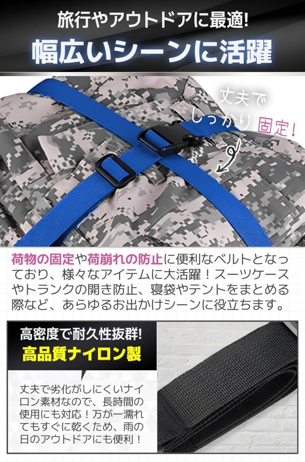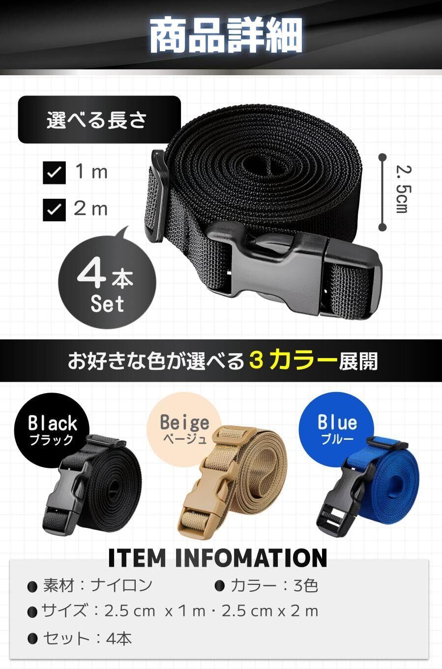 fogman 荷締めベルト 固定ベルト バンド スーツケースベルト 荷造り 結束 耐久性 4本セット (ブラック 2m)