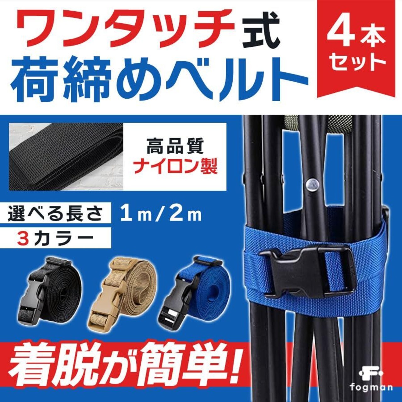 【特価セール】fogman 荷締めベルト 固定ベルト バンド スーツケースベルト 荷造り 結束 耐久性 4本セット (ブラック 2m)