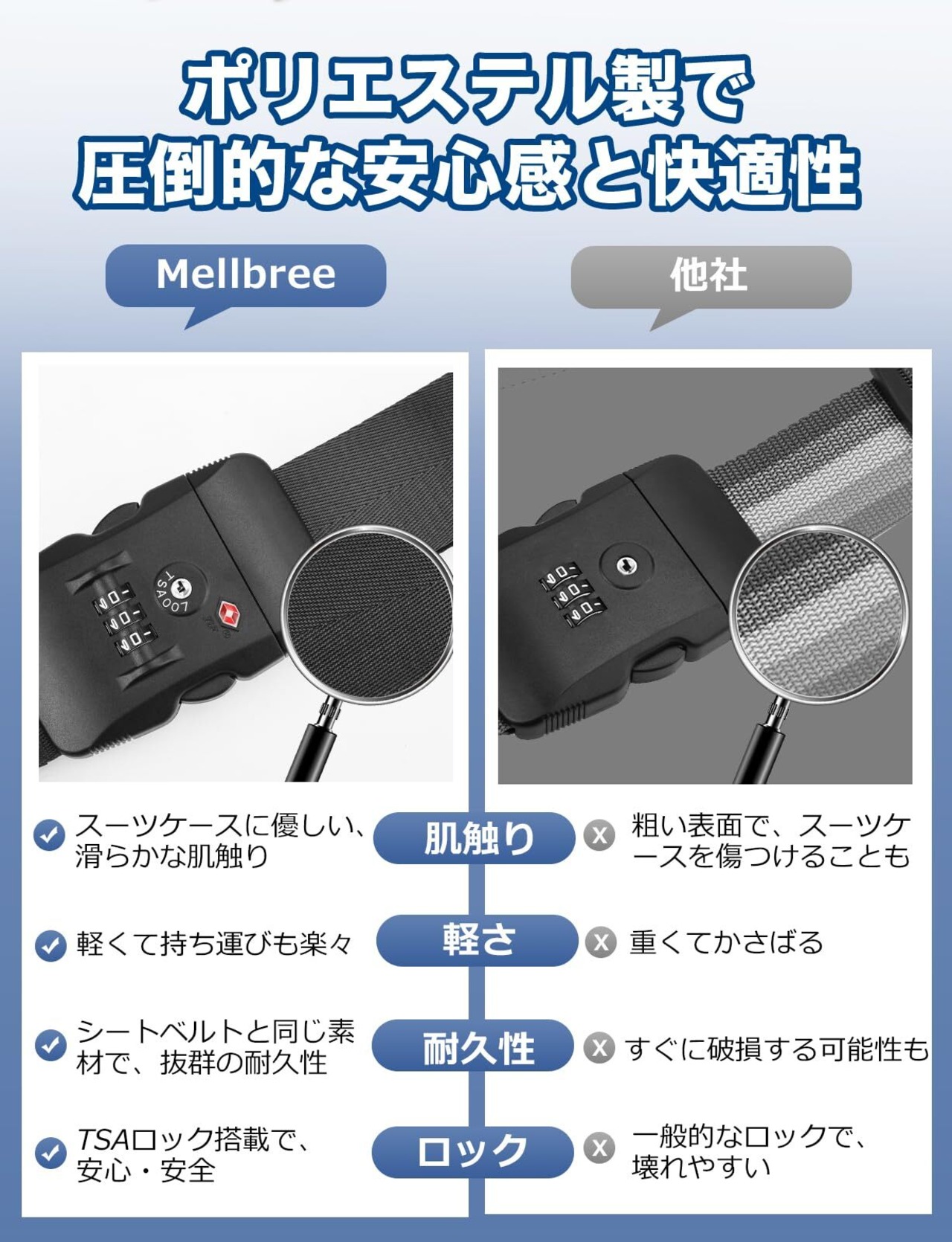 【在庫限り】Mellbree 【正規TSA認証】スーツケースベルト TSAロック TSA鍵付き 高級ポリエステル素材 軽量 盗難・紛失・荷崩れ防止 スーツケース用 長さ調節可能 海外旅行 便利グッズ 出張 (ネービー)