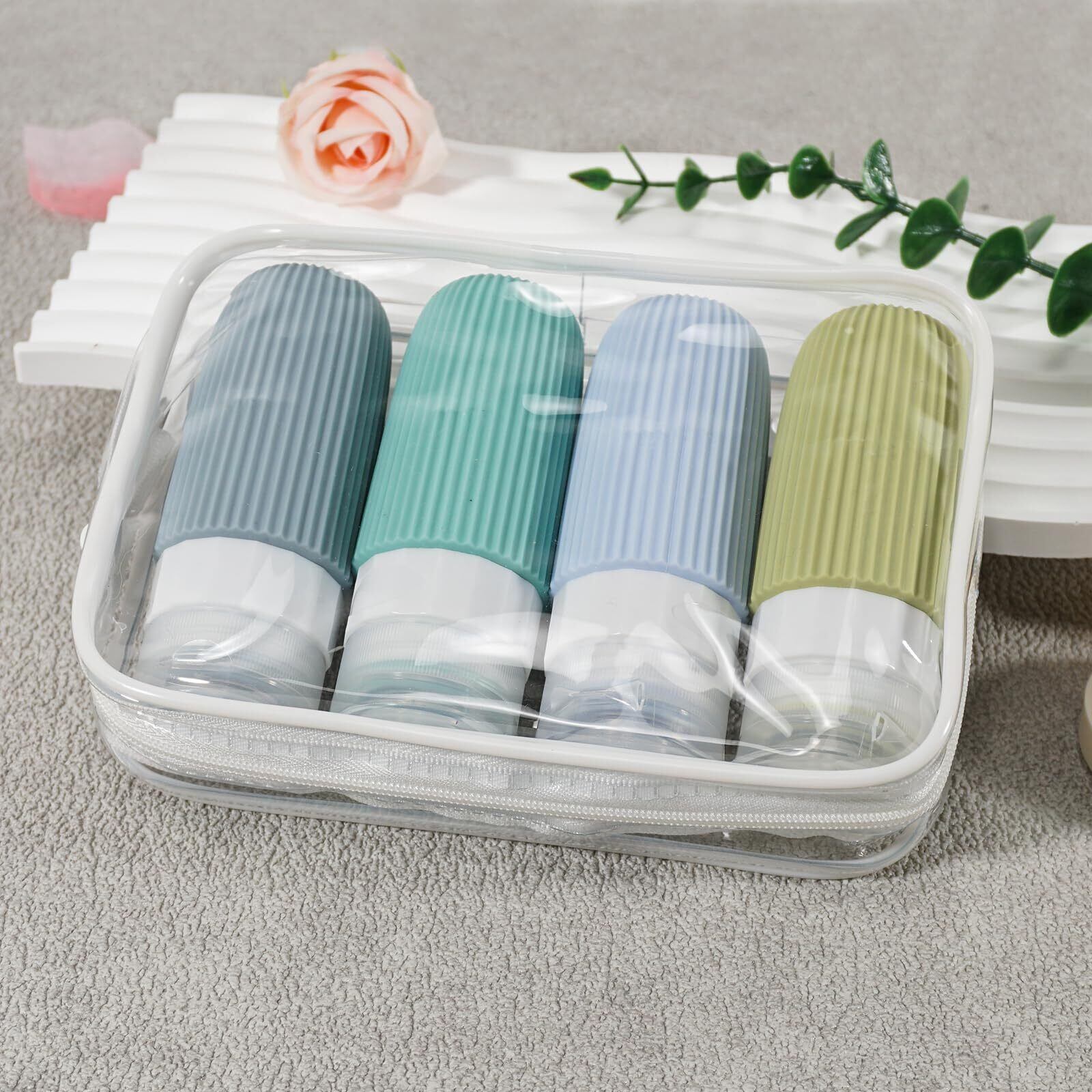【TSA機内持ち込み対応】 2oz(60ml)のシリコン製トラベルボトル4本セット。シャンプー、コンディショナー、ボディソープ、ローション、ハンドサニタイザーなどに最適です。高品質な透明ジッパー付きポーチが付属し、省スペースで持ち運びに便利。