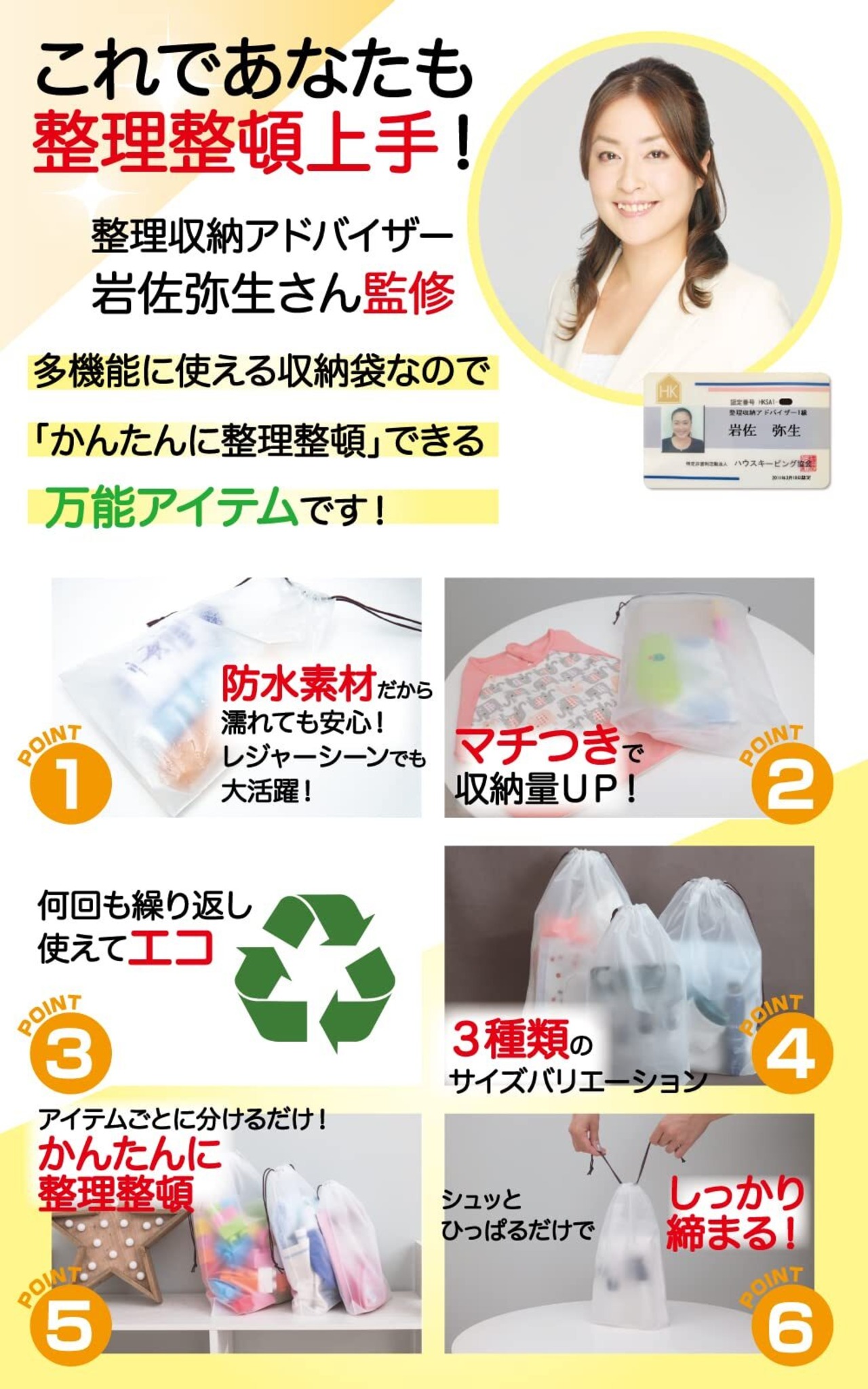 【整理収納アドバイザー岩佐弥生さん監修】 「防水仕様」なので万能に使えて、「かんたんに整理整頓」できる万能アイテムです ・防水素材だから濡れても安心!レジャーシーンでも大活躍 ・半透明なので中身が分かりやすい ・マチつきで収納量UP! ・何回も繰り返し使えてエコ ・3種類のサイズバリエーション ・アイテムごとに分けるだけ!かんたんに整理整頓 ・汚れても洗って使えて丈夫! ・使わない時はクルクル丸めてコンパクトに保管できる ・フックにかけても使える! "